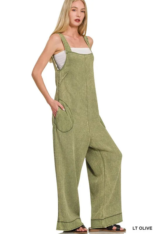 Double gauze washed wide leg overalls are a stylish and comfortable clothing option that combines a trendy silhouette with a soft and breathable fabric. The double gauze material has a lightweight and airy feel, making it perfect for warmer weather. The washed finish gives the overalls a relaxed and slightly worn-in look that adds to their charm. The wide leg design adds a fashionable touch, and the overalls can be styled in various ways for a casual and chic outfit. Pair them with a simple t-shirt or tank top underneath and accessorize with sneakers or sandals for a laid-back and effortless look. These overalls are versatile and can be worn for various occasions, from running errands to a casual day out with friends.