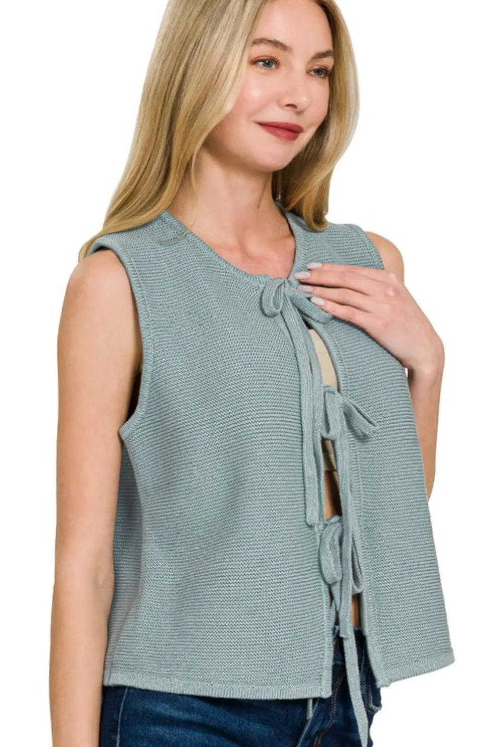 A Tie Front Sweater Vest is a stylish and versatile wardrobe piece that combines the warmth of a sweater with the trendiness of a vest. This garment typically features a sleeveless design with a tie front closure, allowing you to adjust the fit and style to your preference. The sweater material provides comfort and coziness, making it perfect for layering over tops or dresses in cooler weather. The tie front detail adds a touch of sophistication and can be styled in various ways, such as tied in a knot or bow. A Tie Front Sweater Vest is a chic and functional addition to your wardrobe, offering both style and versatility for creating fashionable outfits.