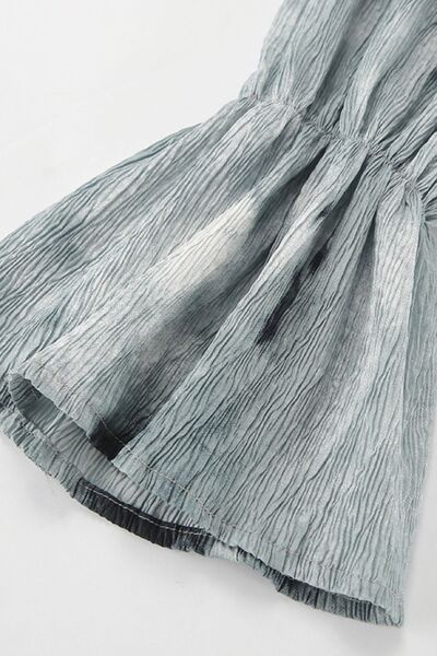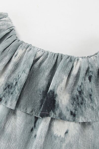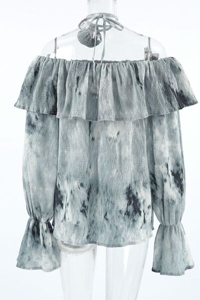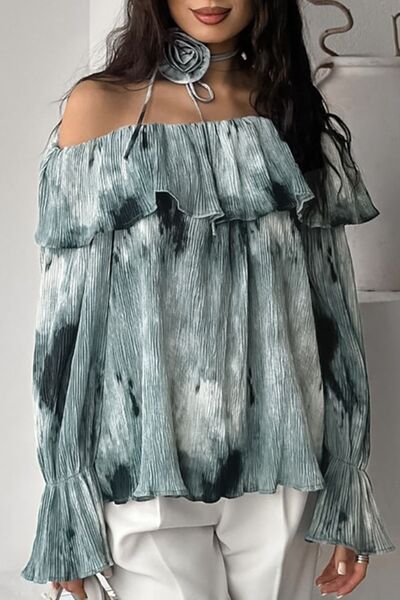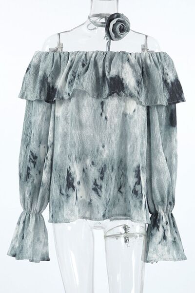 Printed Ruffled Off-Shoulder Blouse with Flower Neck Tie