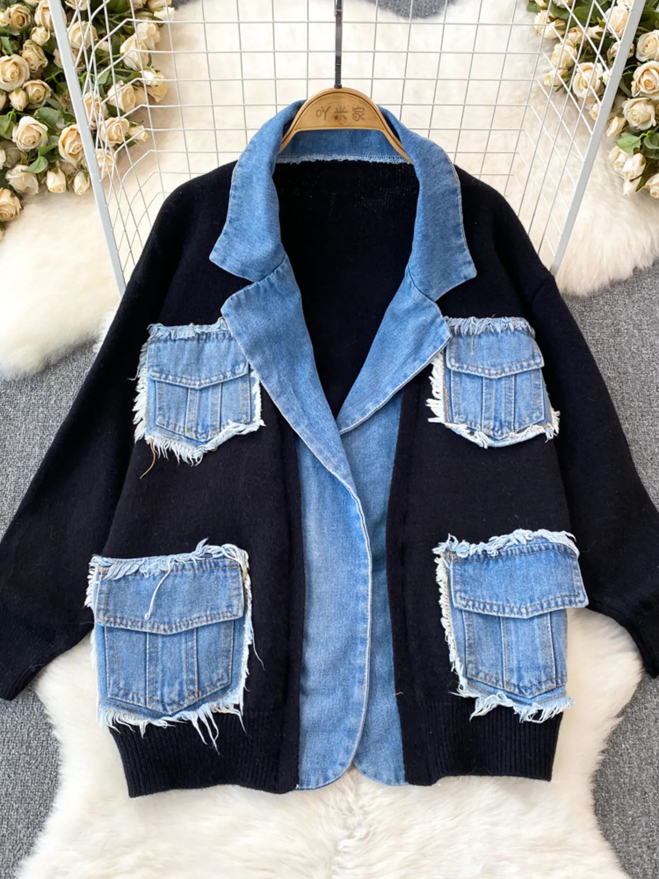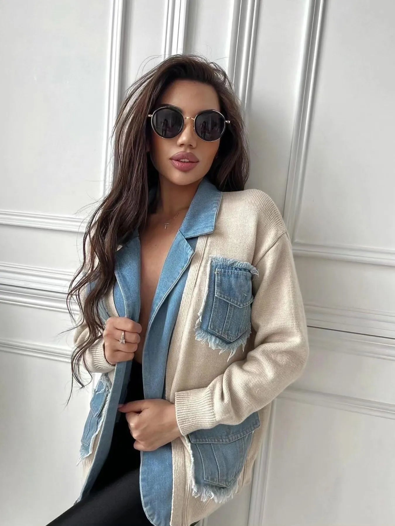 Raw Hem Denim Pocket Patchwork Cardigan