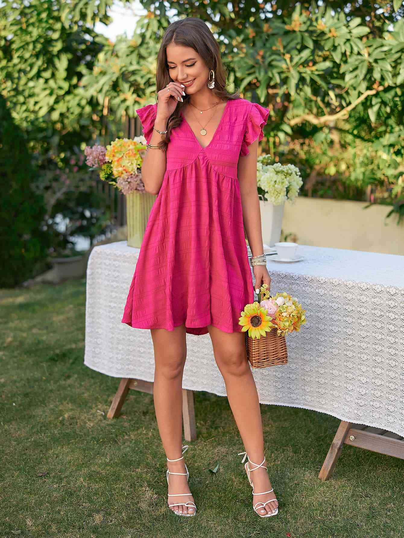 Stripe Flare Sleeve Half Placket Tiered Flowy Mini Dress