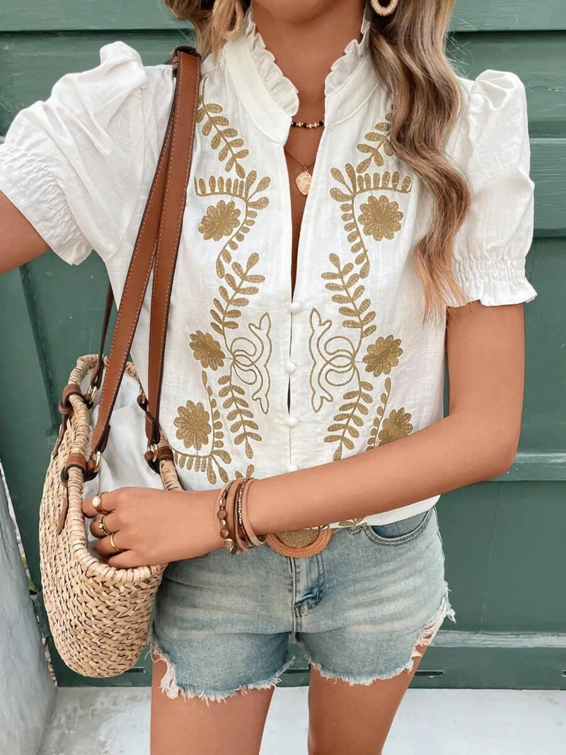 Embroidered Frill Notched Short Sleeve Blouse