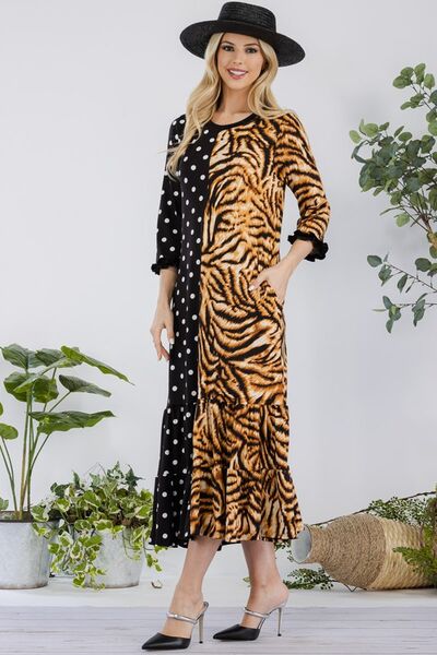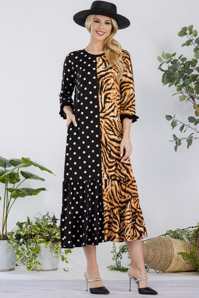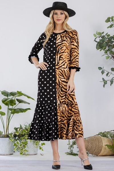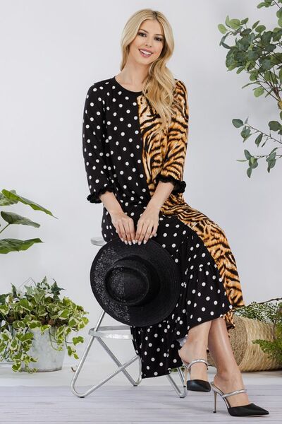 Celeste Full Size Polka Dot & Leopard Round Neck Midi Dress Plus Size
