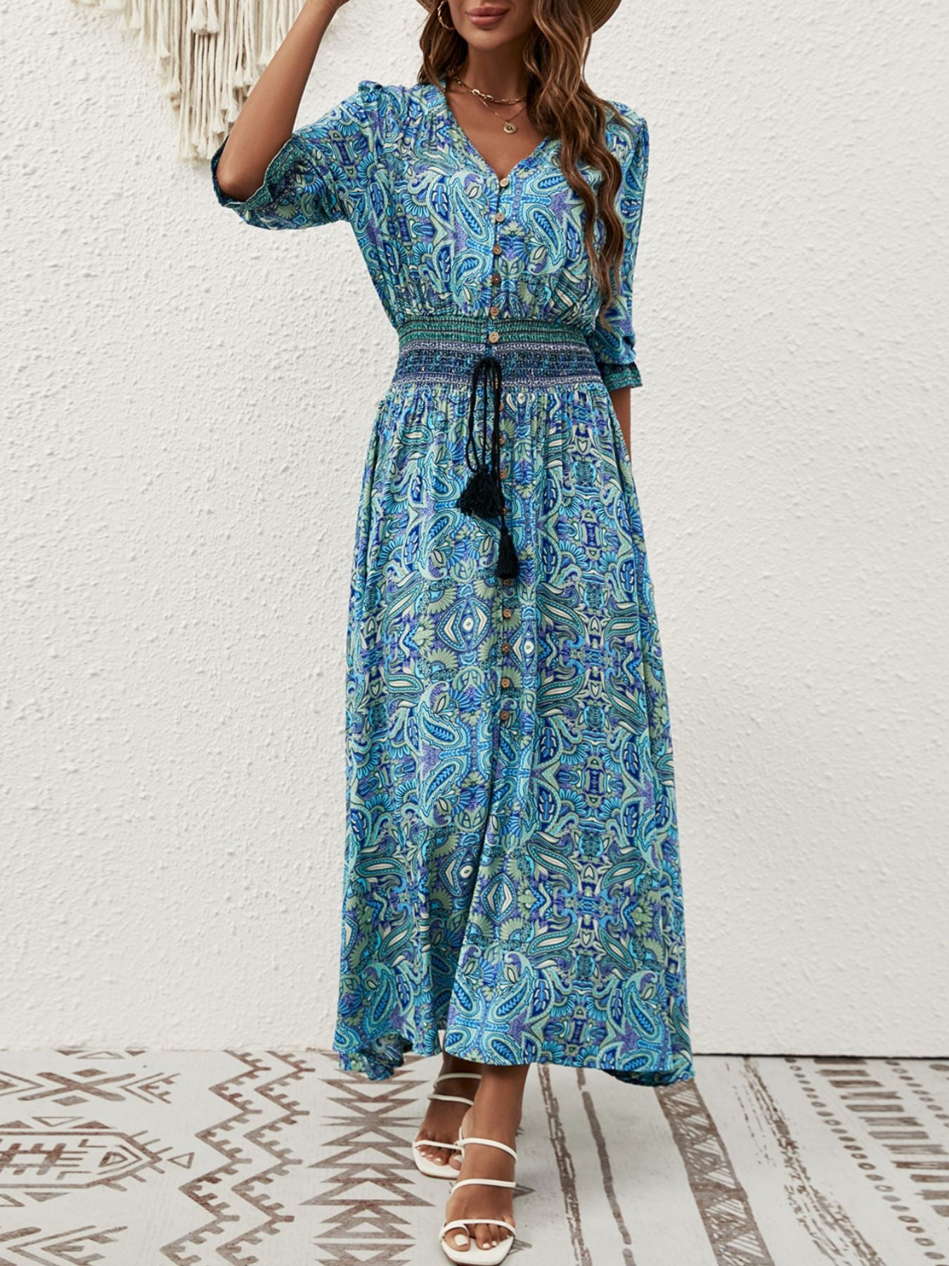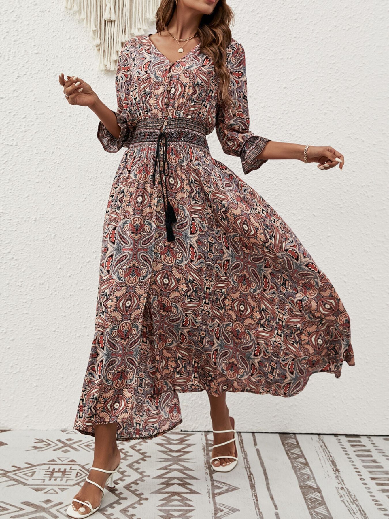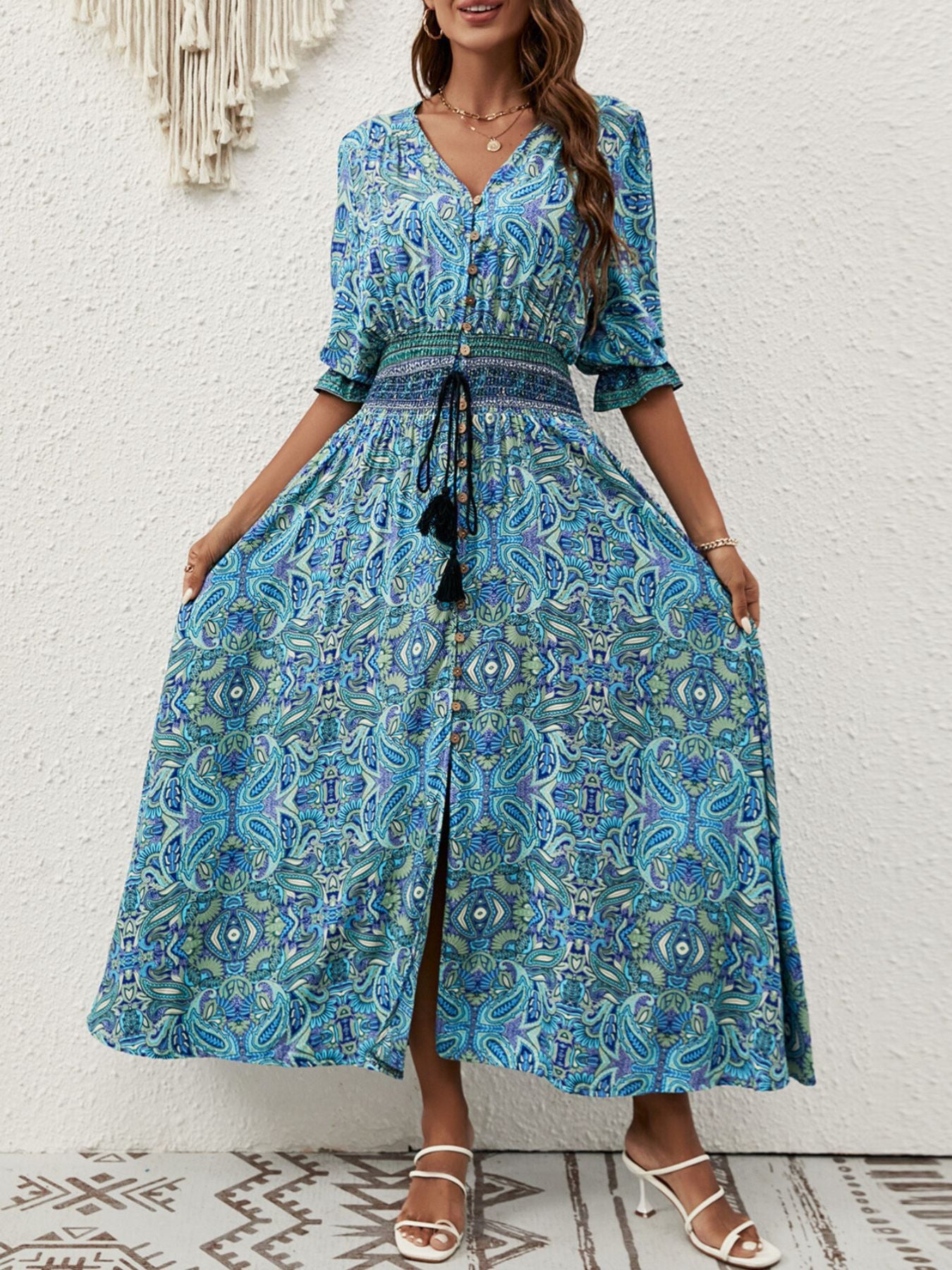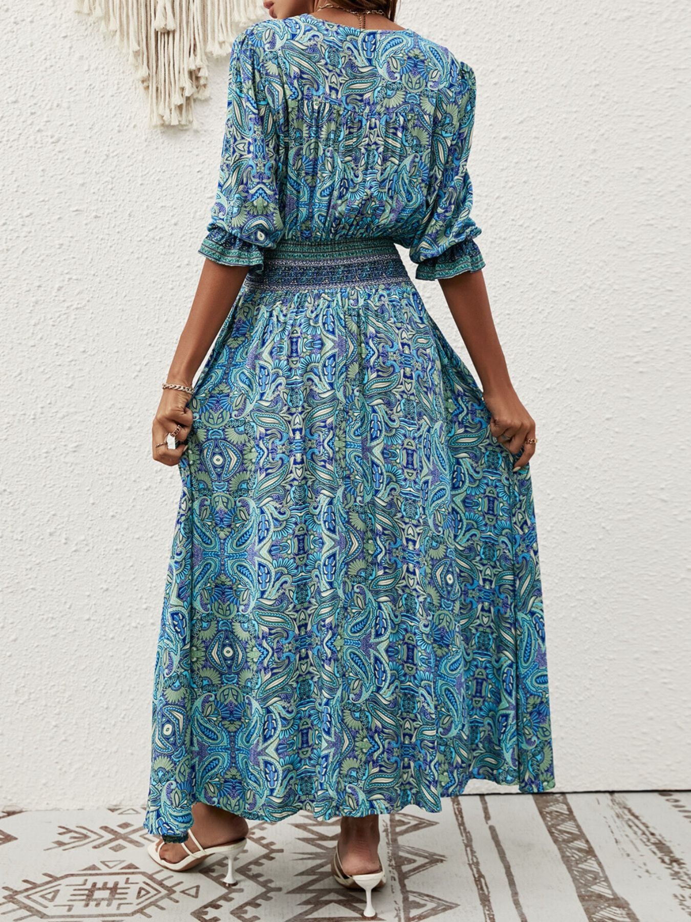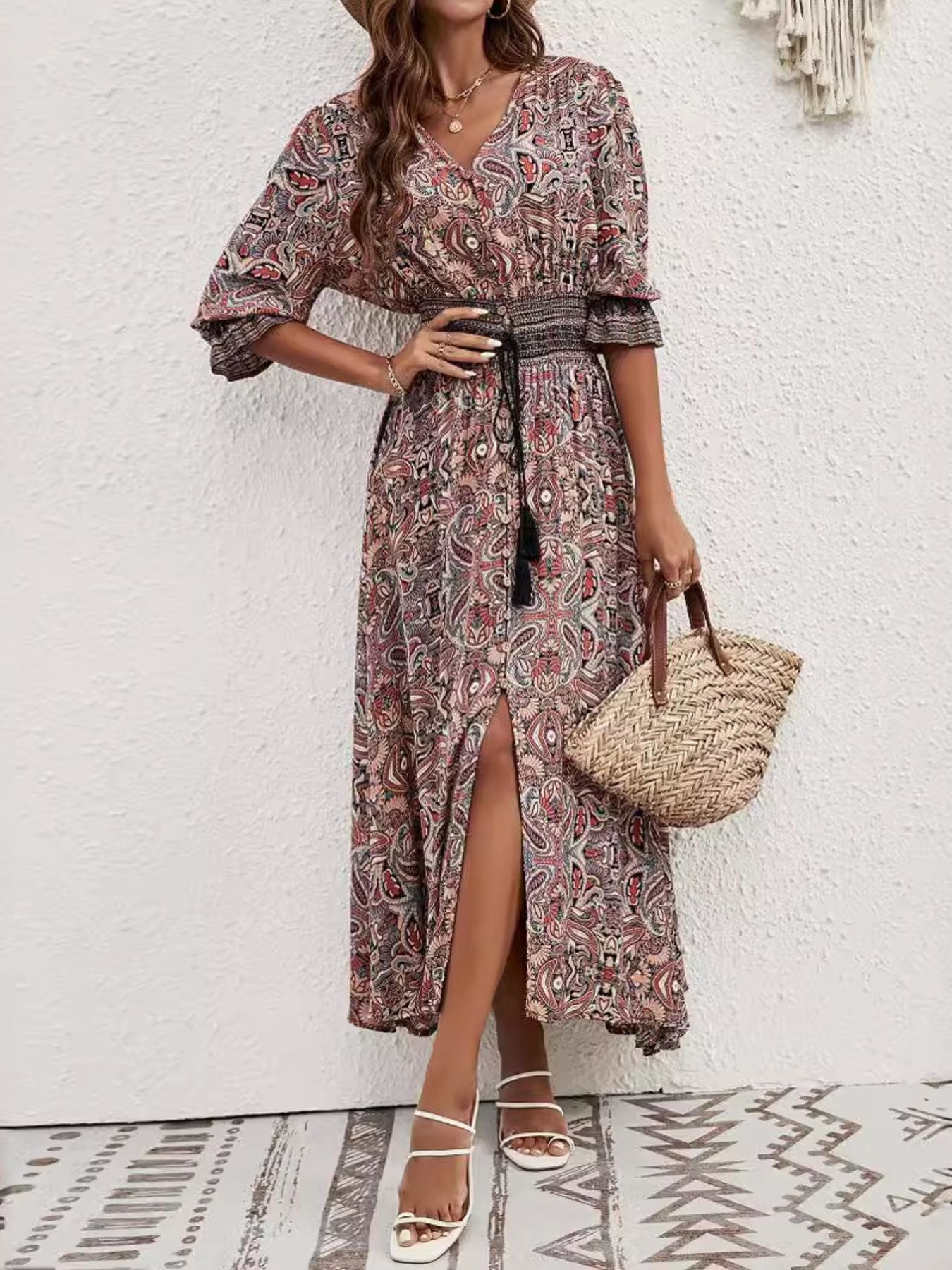 Paisley Print Half Sleeve Slit Midi Dress