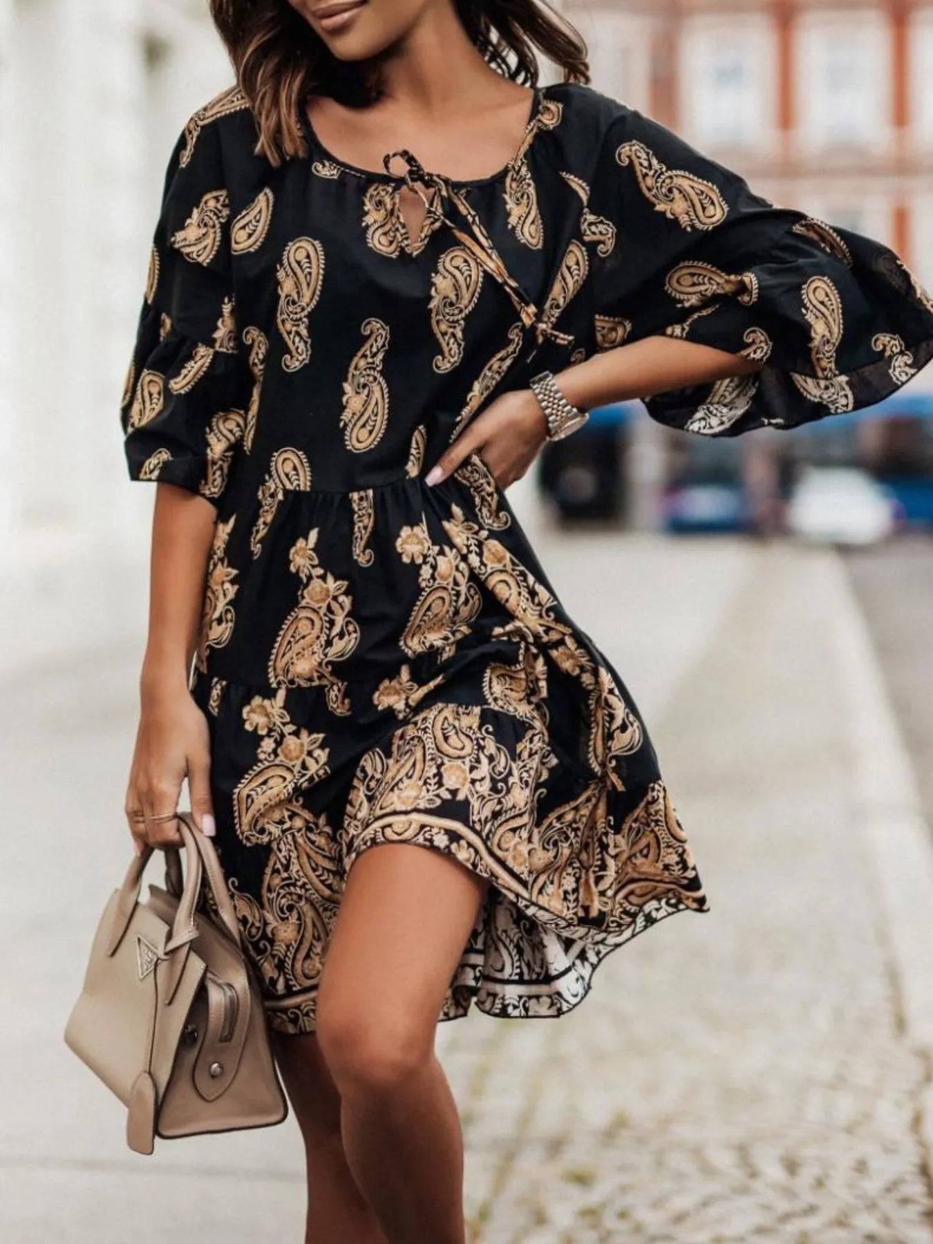 Paisley Print Tie Neck Half Sleeve Mini Dress
