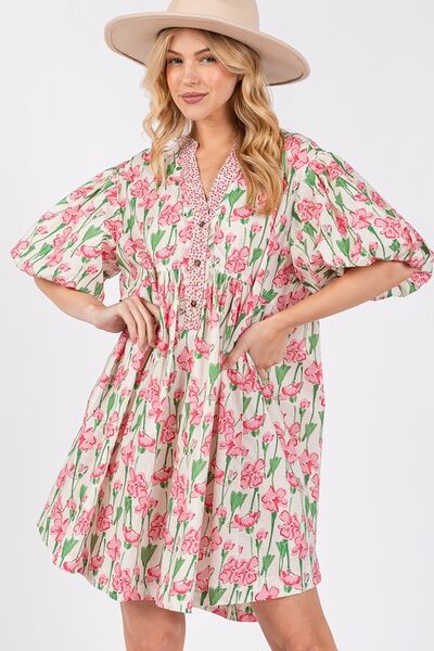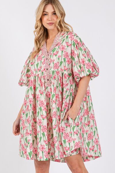 SAGE + FIG Floral Half Button Notched Puff Sleeve Dress