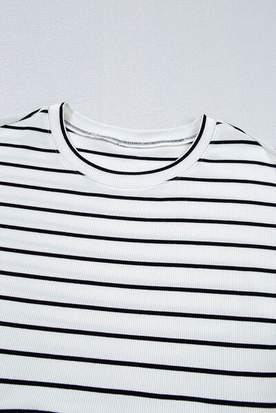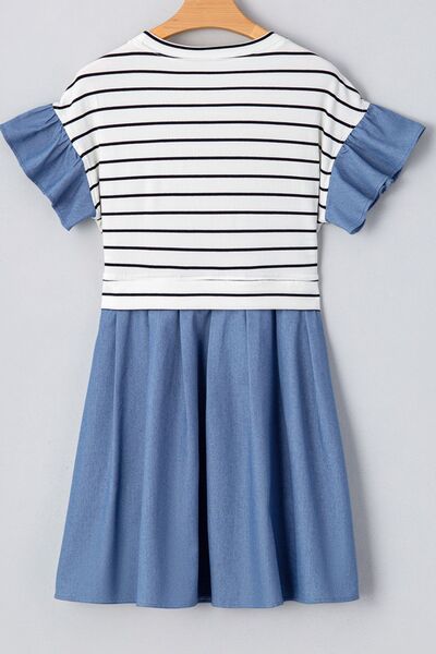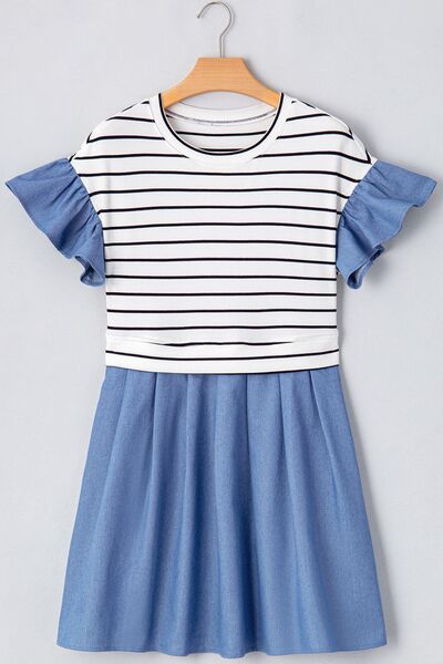Stripe Ruffle Denim Patchwork Round Neck Mini Dress
