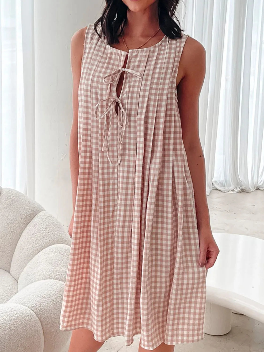 Tied Front Sleeveless Plaid Dress