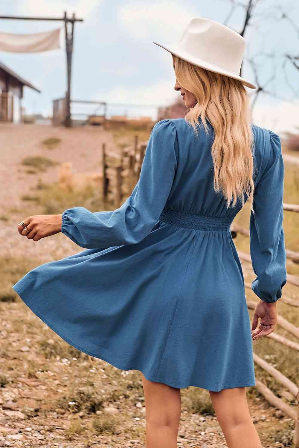V-Neck Long Sleeve Smocked Waist Mini Dress
