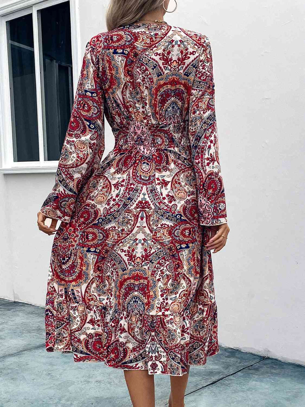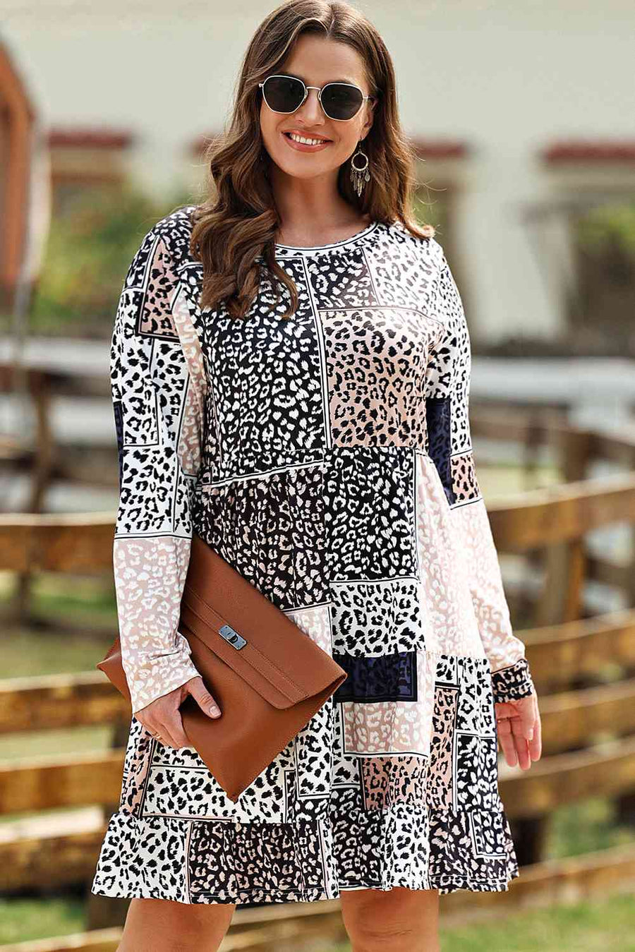 Printed Ruffle Trim Smocked Long Sleeve Mini Dress