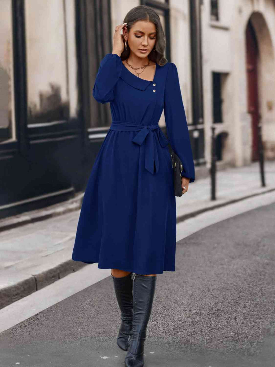 Buttoned Tie Front Long Sleeve Asymmetrical Neck Dress