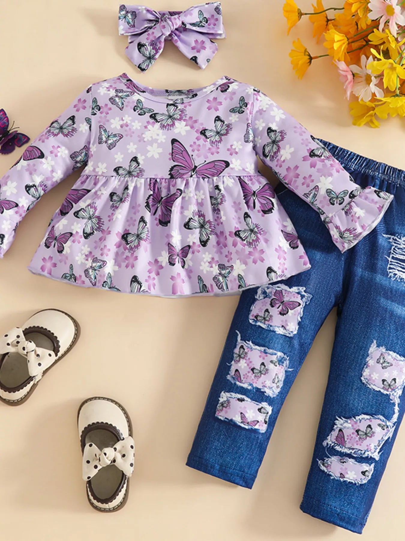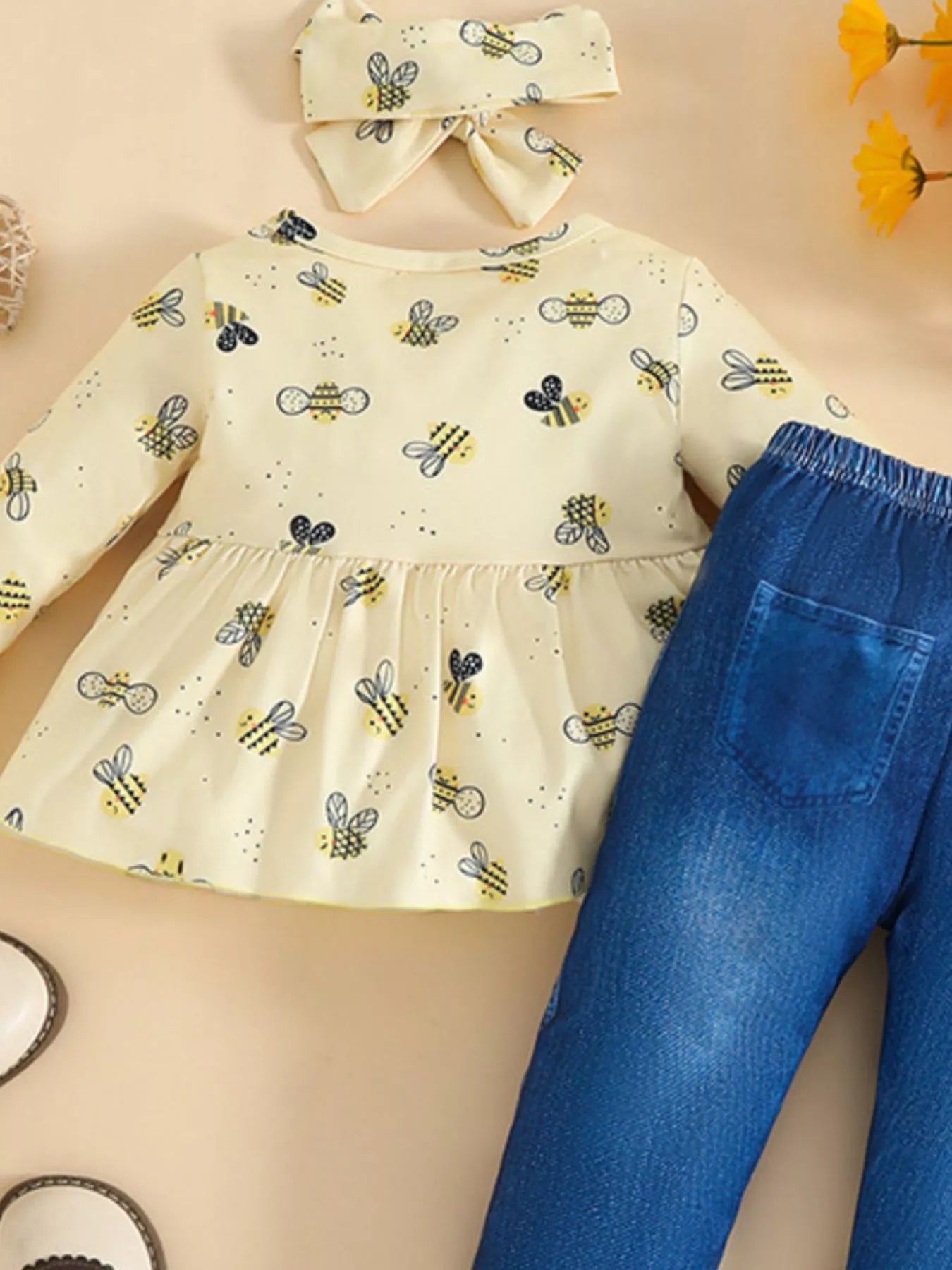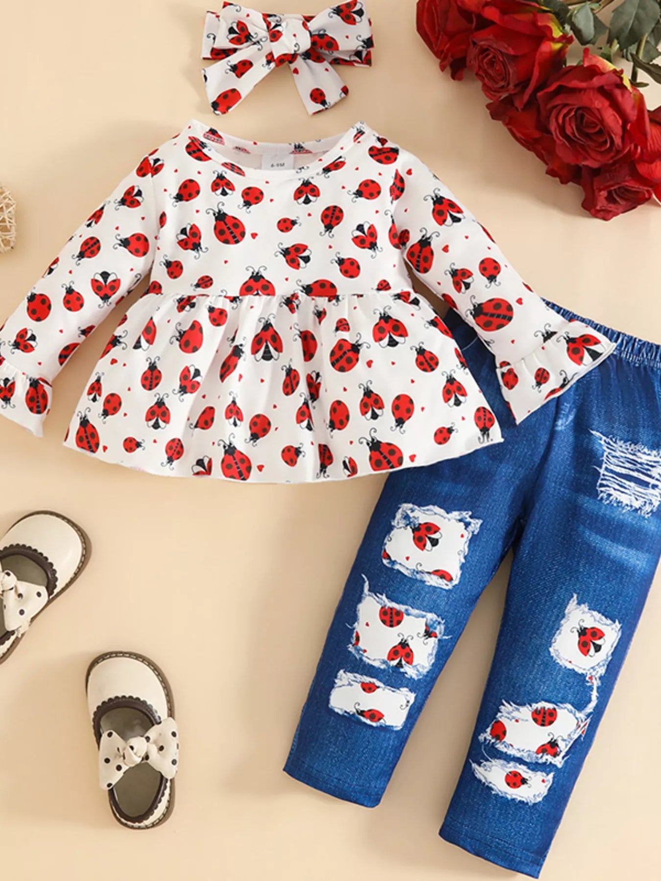 Children's Ladybug Print Ruffle Hem Top & Jeans Set with Headband