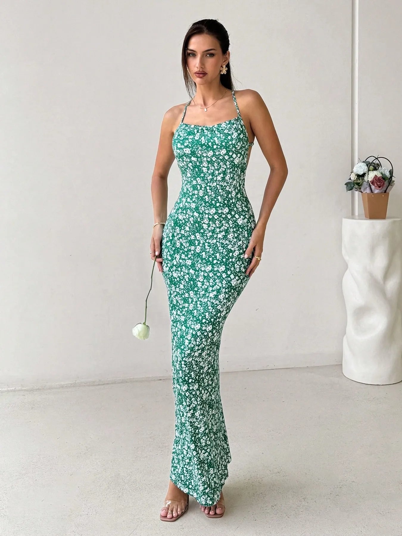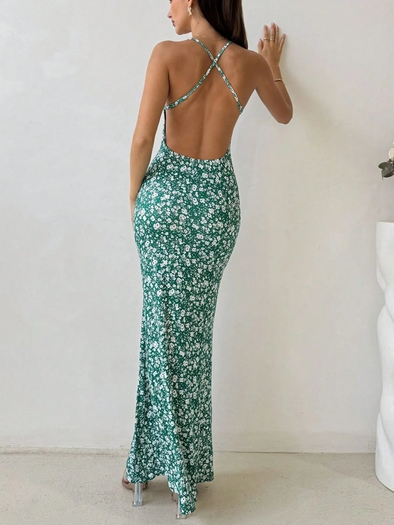 Crisscross Back Floral Print Bodycon Maxi Dress