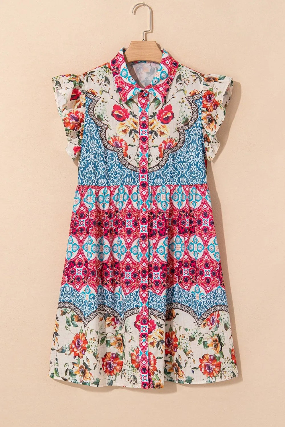 Floral Mixed Pattern Ruffle Flutter Sleeve Buttoned Dress