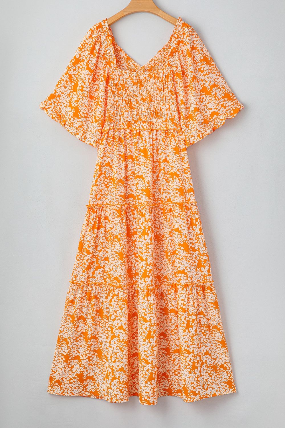 Floral Print Smocked V Neck Wide Sleeve Maxi Dress