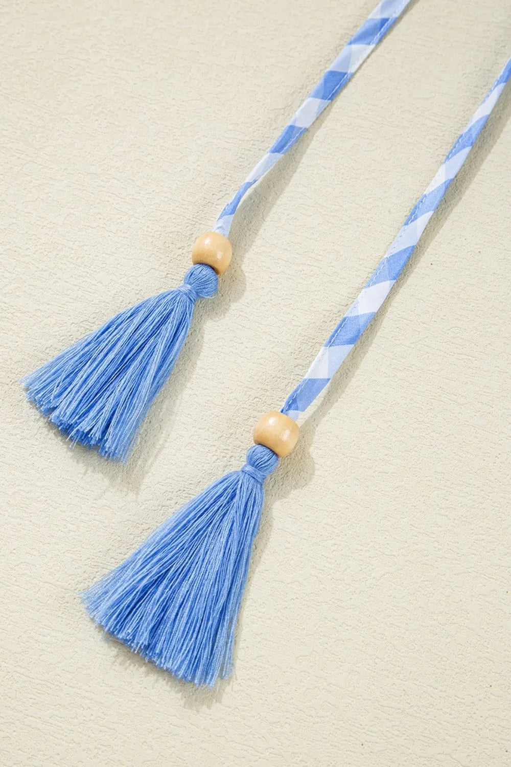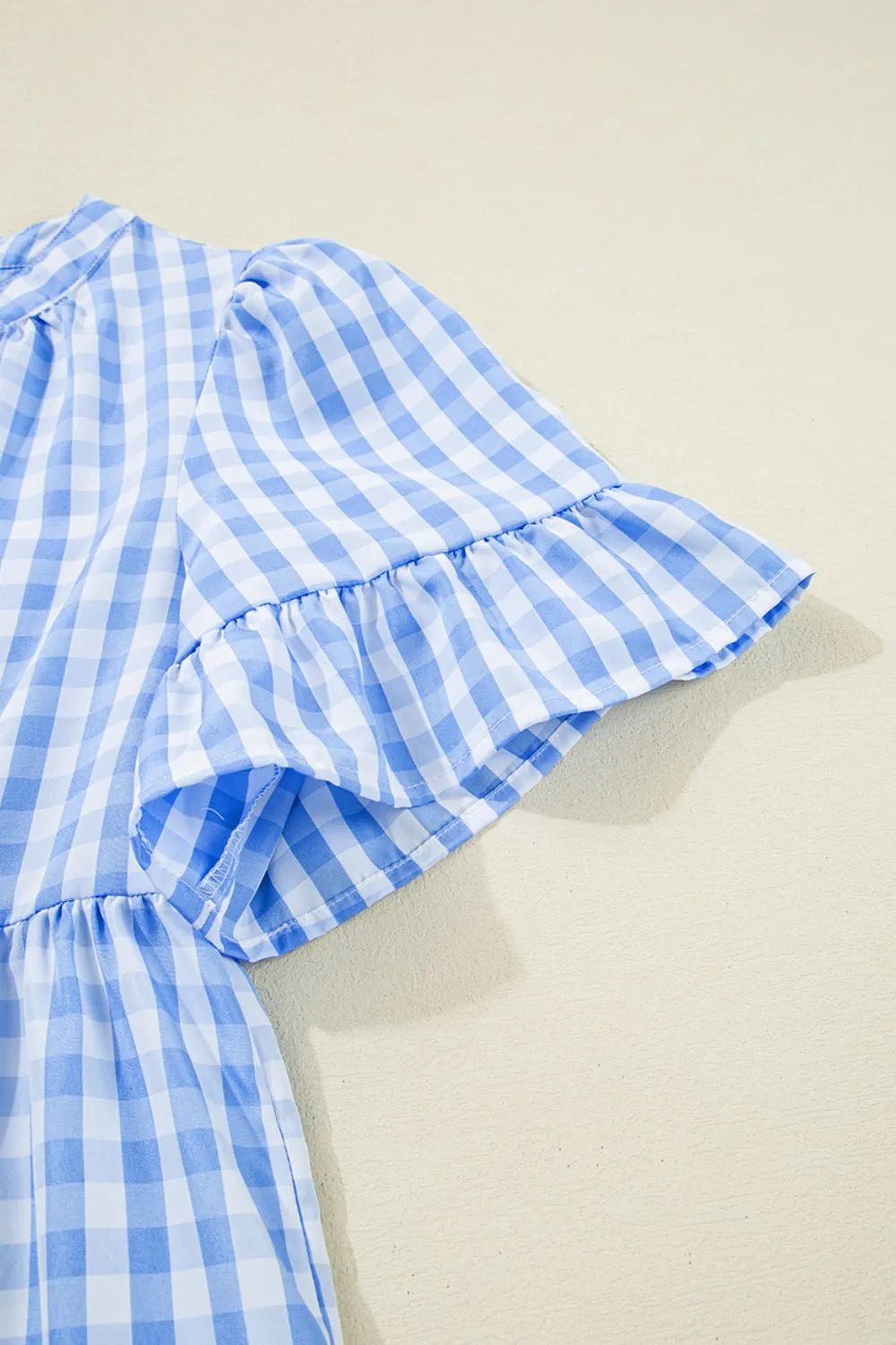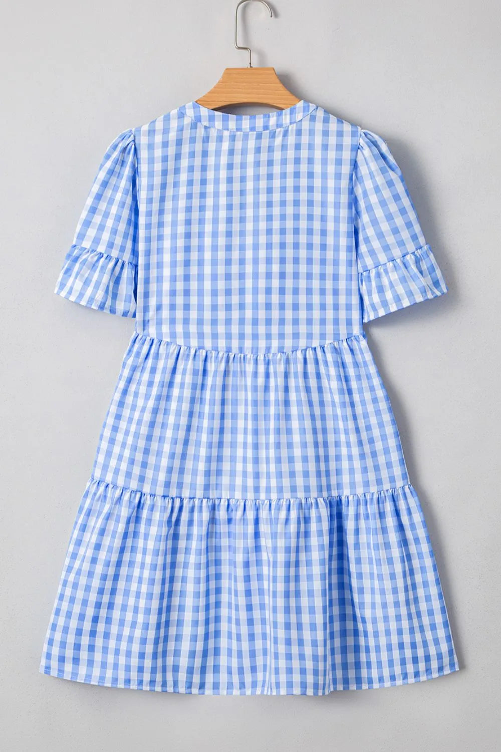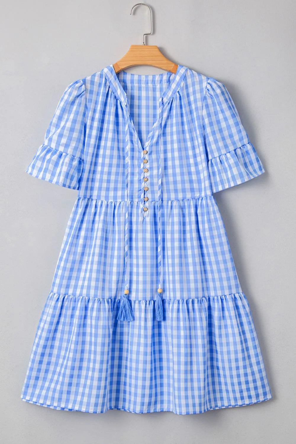Gingham Short Sleeve Button Tie Split Neck Loose Mini Dress