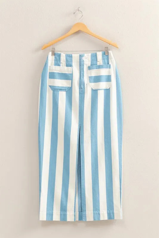 The Striped Pocket Detail Maxi Skirt is a chic and practical addition to your wardrobe. Featuring a stylish striped pattern and convenient pockets, this skirt offers both fashion and functionality. The maxi length adds an elegant touch, making it a versatile piece that can be dressed up or down. Stay comfortable and stylish while on the go with this flattering and trendy maxi skirt that is sure to become a wardrobe favorite.