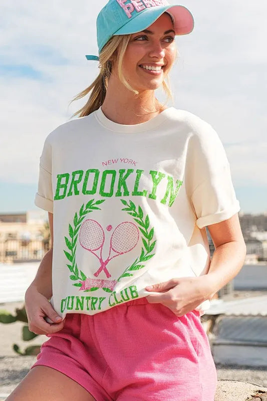 The Brooklyn graphic round neck short sleeve top is a casual and trendy addition to your wardrobe. The graphic print featuring "Brooklyn" adds a cool and urban vibe to the top, perfect for expressing your personal style. The round neck and short sleeves make it easy to wear and style for a laid-back look. Pair it with jeans, shorts, or a skirt for a casual and effortless outfit. Embrace the relaxed and street-style appeal of this Brooklyn graphic round neck short sleeve top for a fashionable and easygoing ensemble.