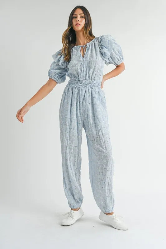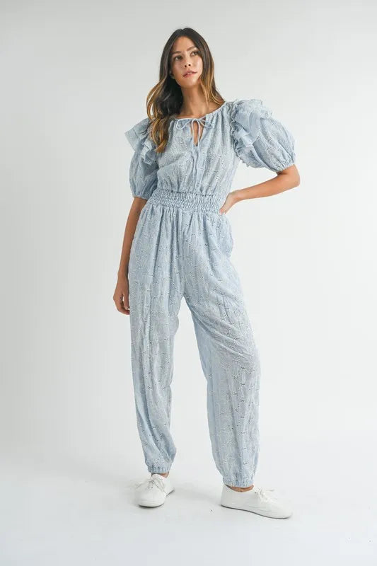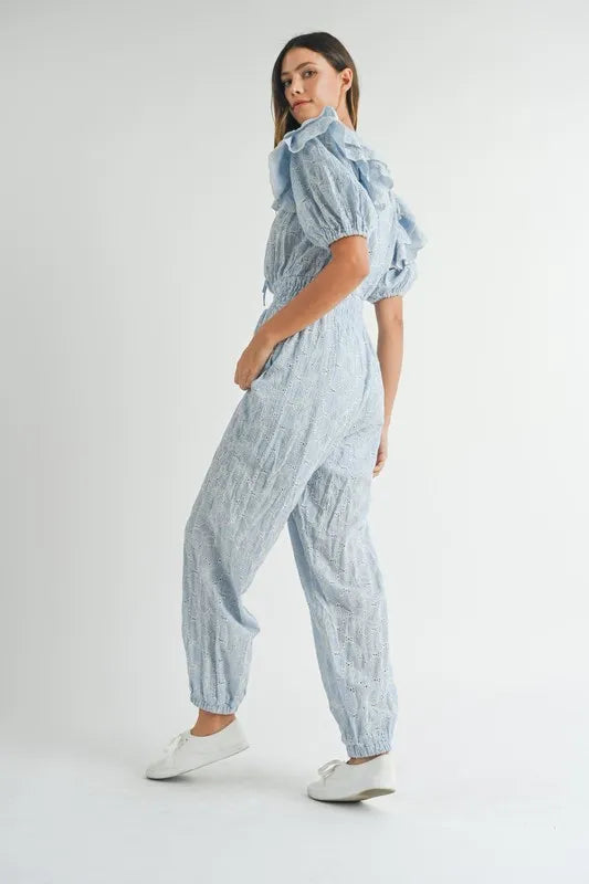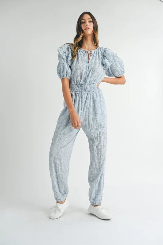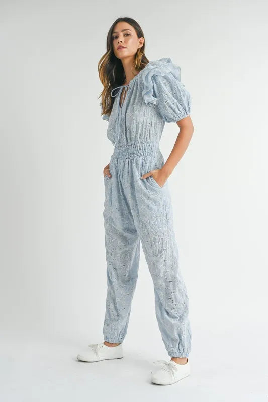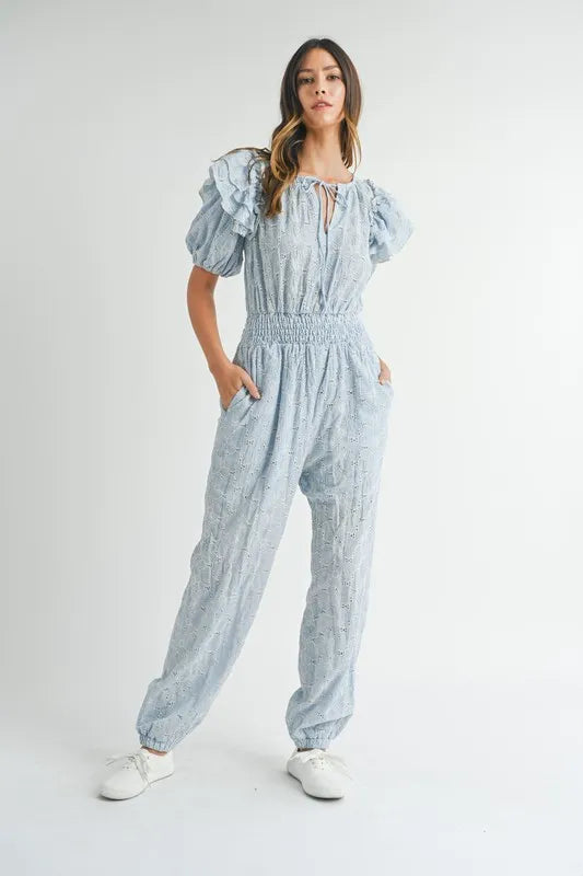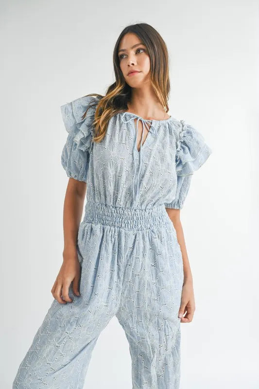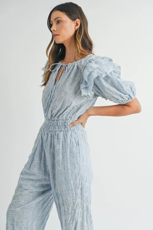 MABLE Eyelet Lace Ruffle Shoulder Jumpsuit