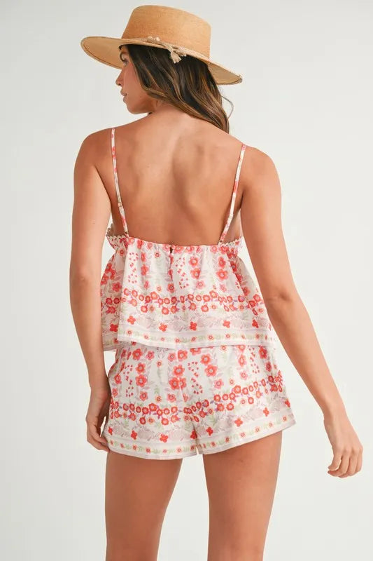 This stylish set features a floral printed peplum top and matching shorts. The peplum top adds a feminine touch, while the shorts provide a comfortable and trendy look. Perfect for a casual day out or a fun summer gathering.