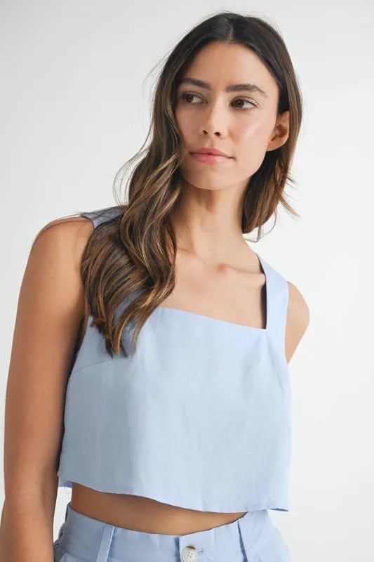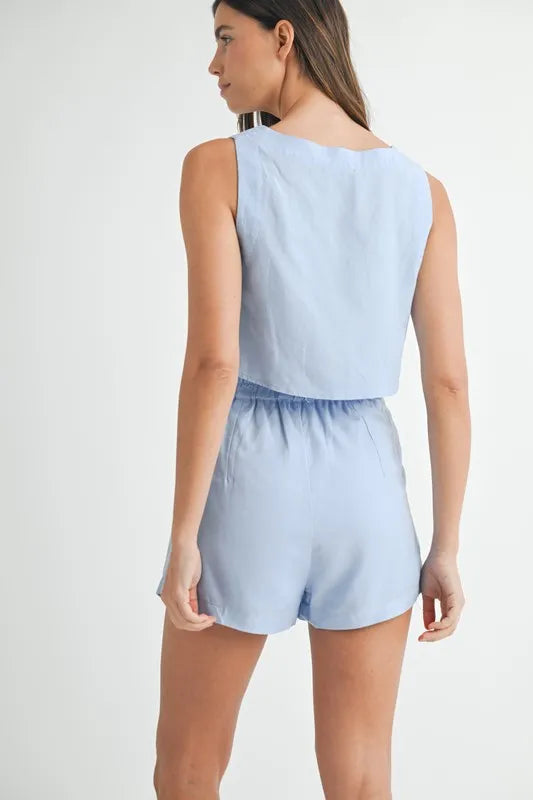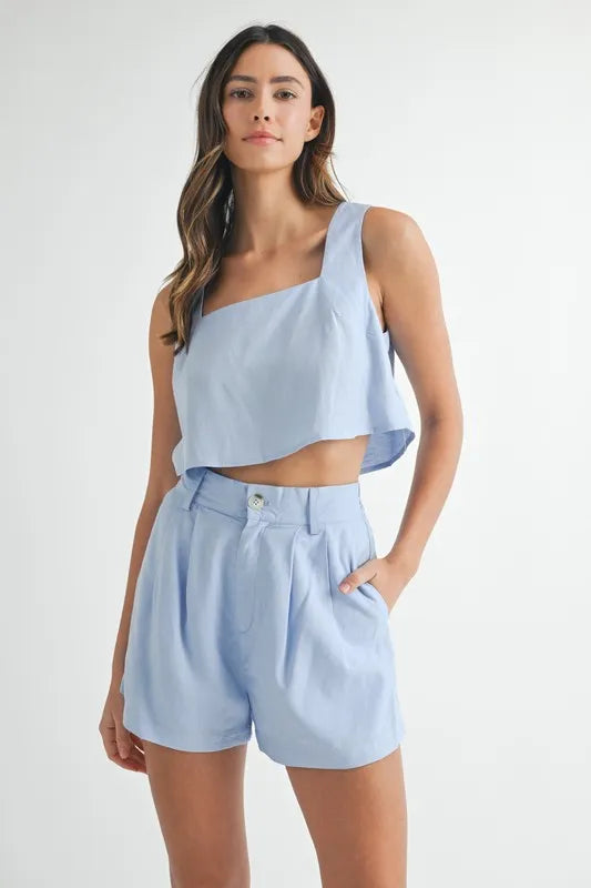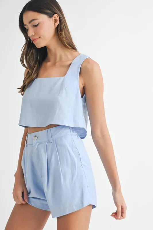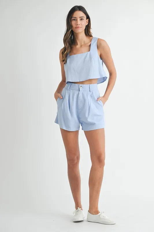This sleeveless crop top and shorts set is perfect for staying cool and stylish during warm weather. The simple yet trendy design makes it easy to mix and match with other pieces in your wardrobe. Stay comfortable and chic all day long in this versatile ensemble.