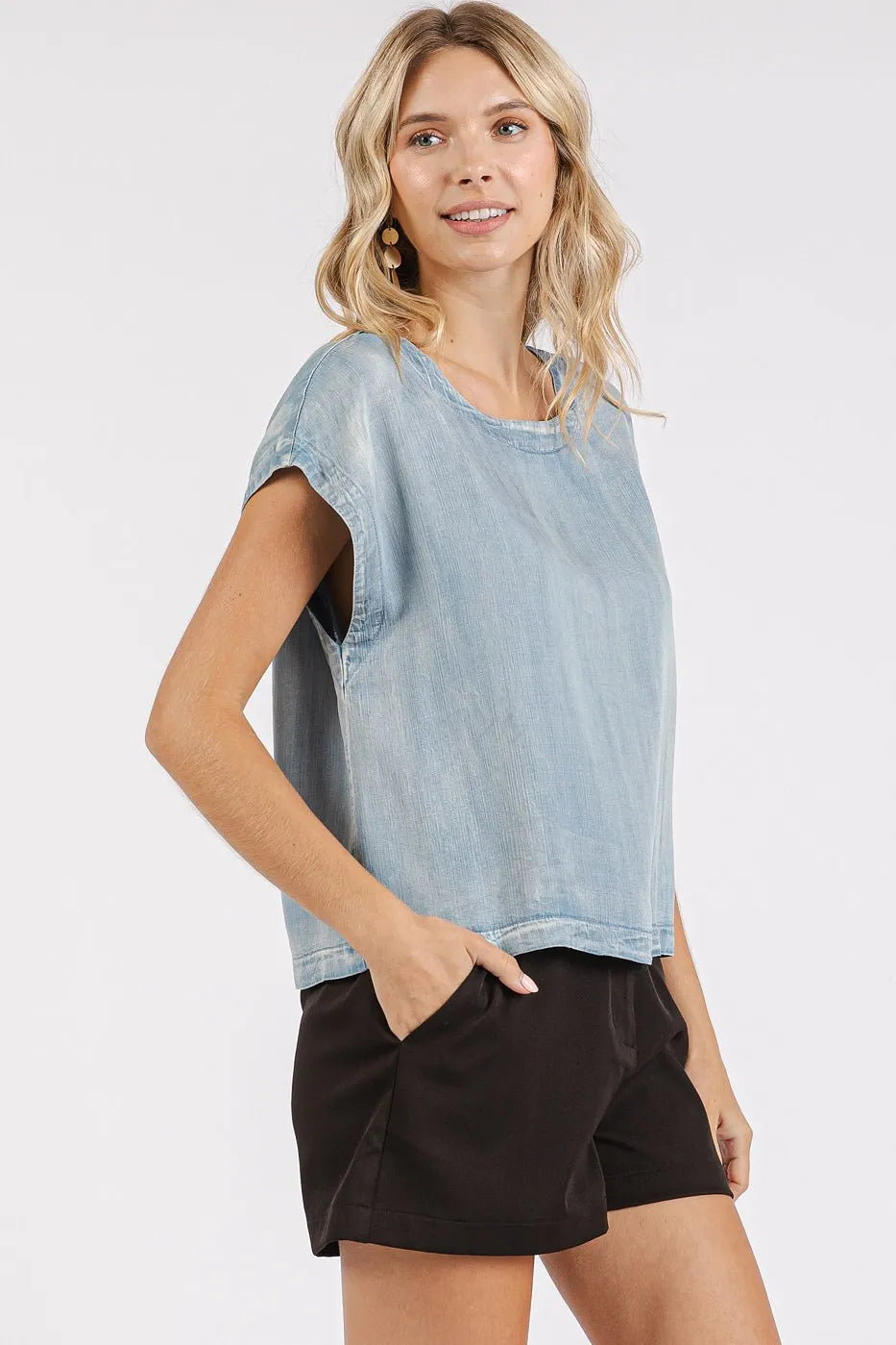 Elevate your casual style with this washed chambray back button cap sleeve top. The back button detail adds a unique and stylish touch to this classic chambray top. With cap sleeves, it's perfect for warmer days and can be dressed up or down. Pair it with white jeans or denim shorts for a chic and effortless summer look.