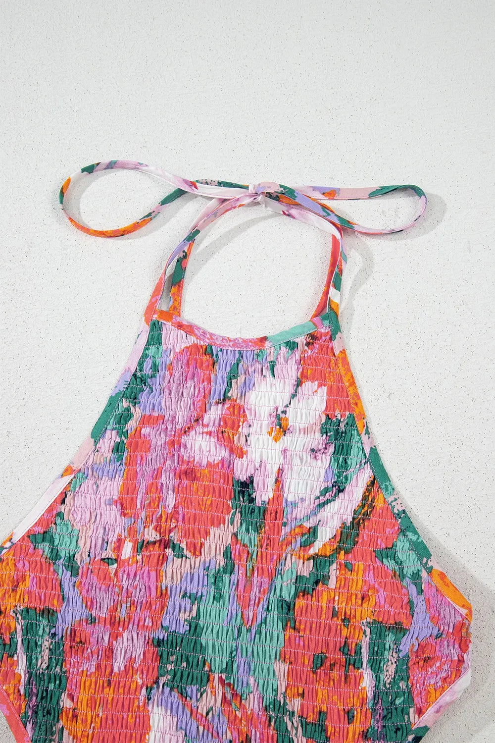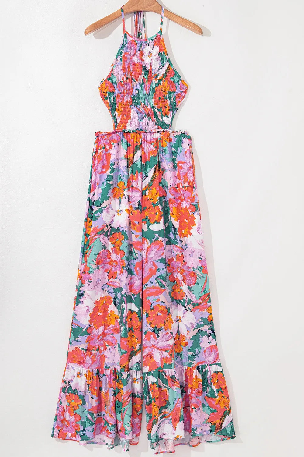 Multicolour Floral Print Smocked Halter Neck Sleeveless Wide Leg Jumpsuit