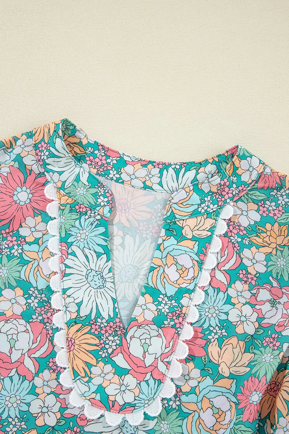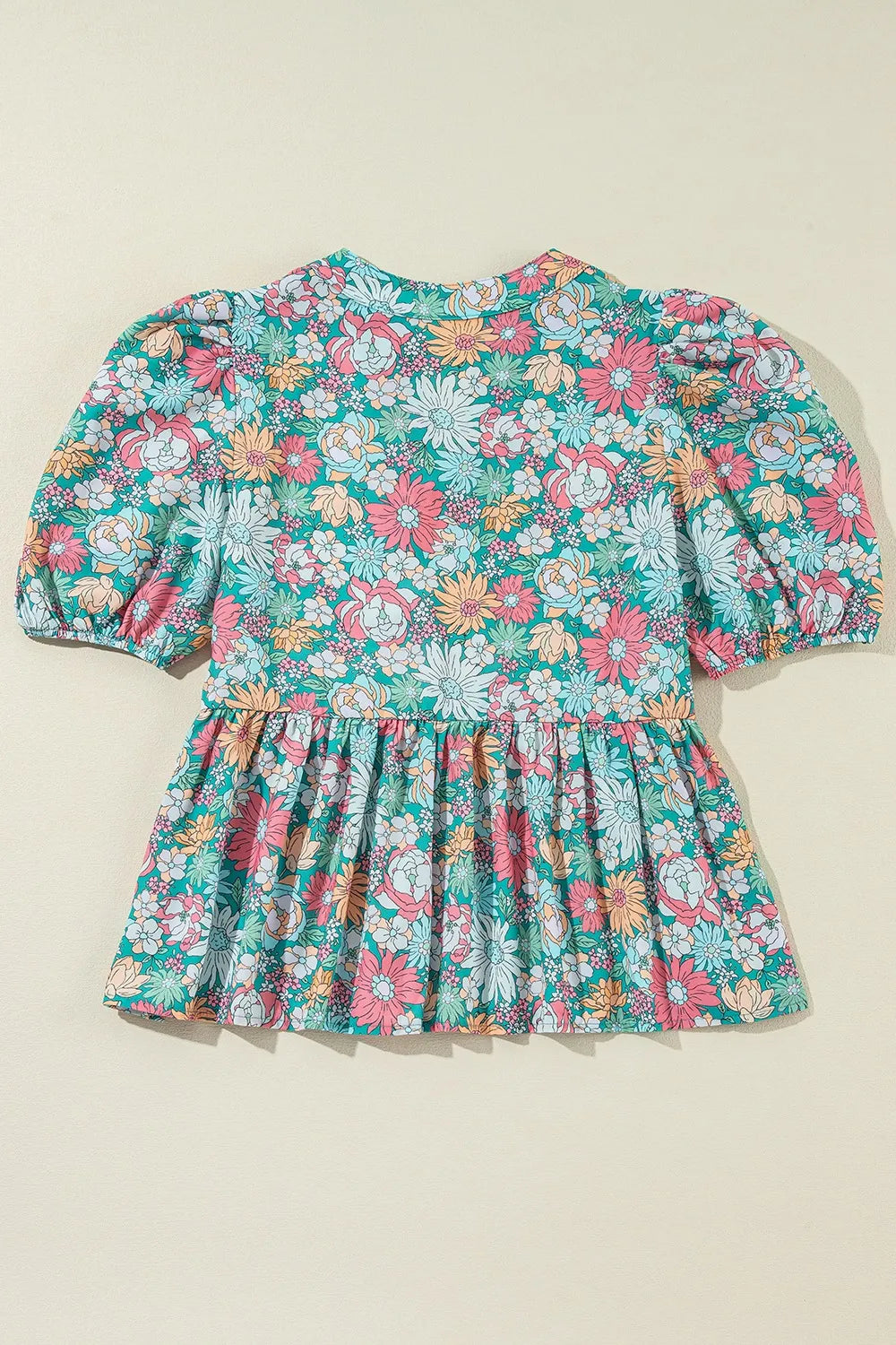 Multicolour Notched Neck Puff Short Sleeve Floral Blouse