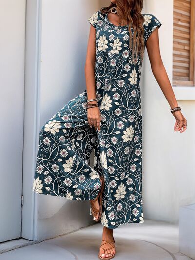 Perfee Printed Round Neck Cap Sleeve Wide Leg Jumpsuit
