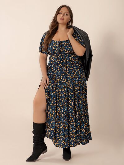 Plus Size Printed Short Sleeve Slit Tiered Maxi Dress