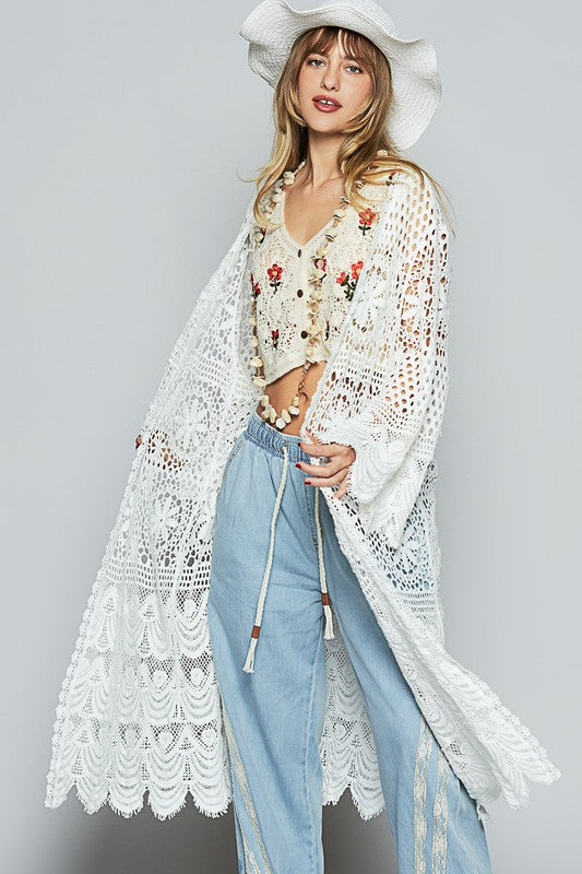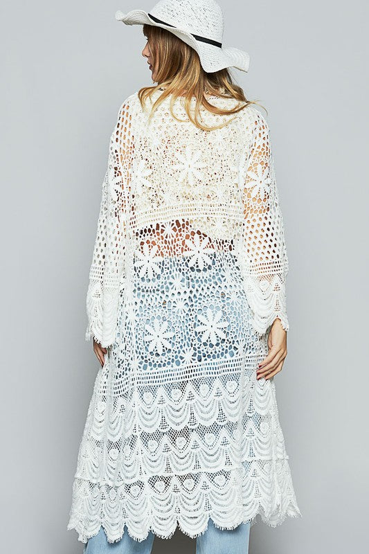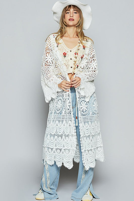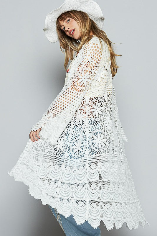 POL Crochet Open Front Long Sleeve Longline Cardigan