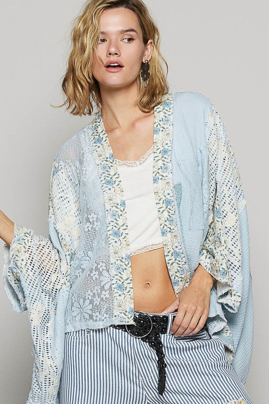 POL Floral Lace Crochet Patch Open Front Double Gauze Cardigan