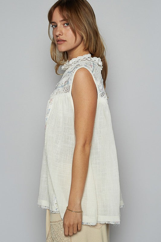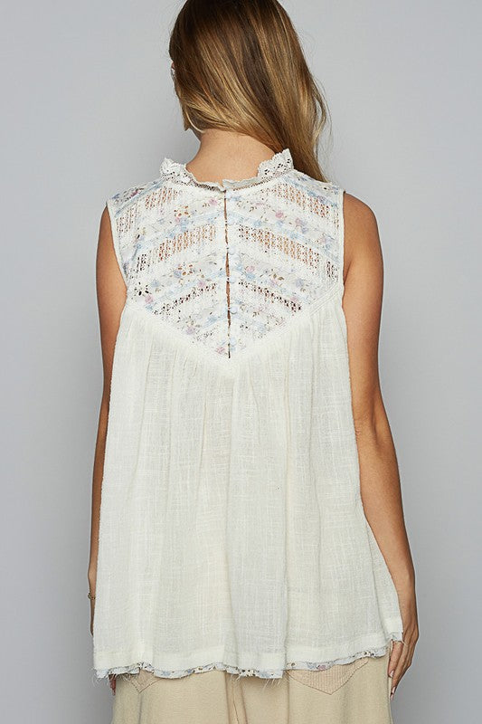 POL Lace Detail Floral Sleeveless Rayon Gauze Top
