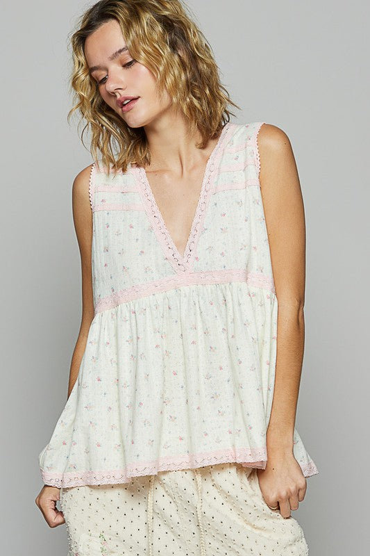 POL Lace Detail Floral V-Neck Sleeveless Top