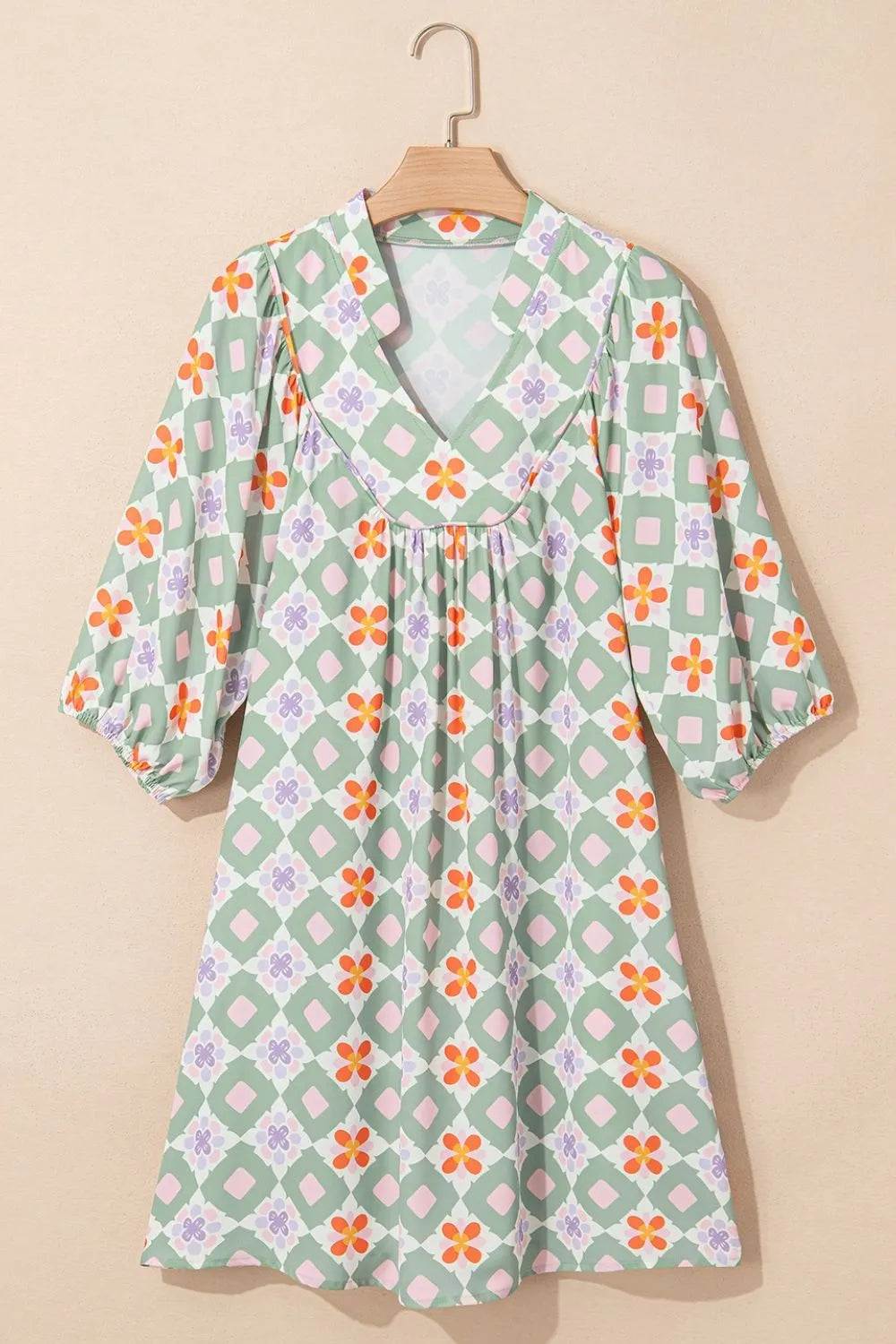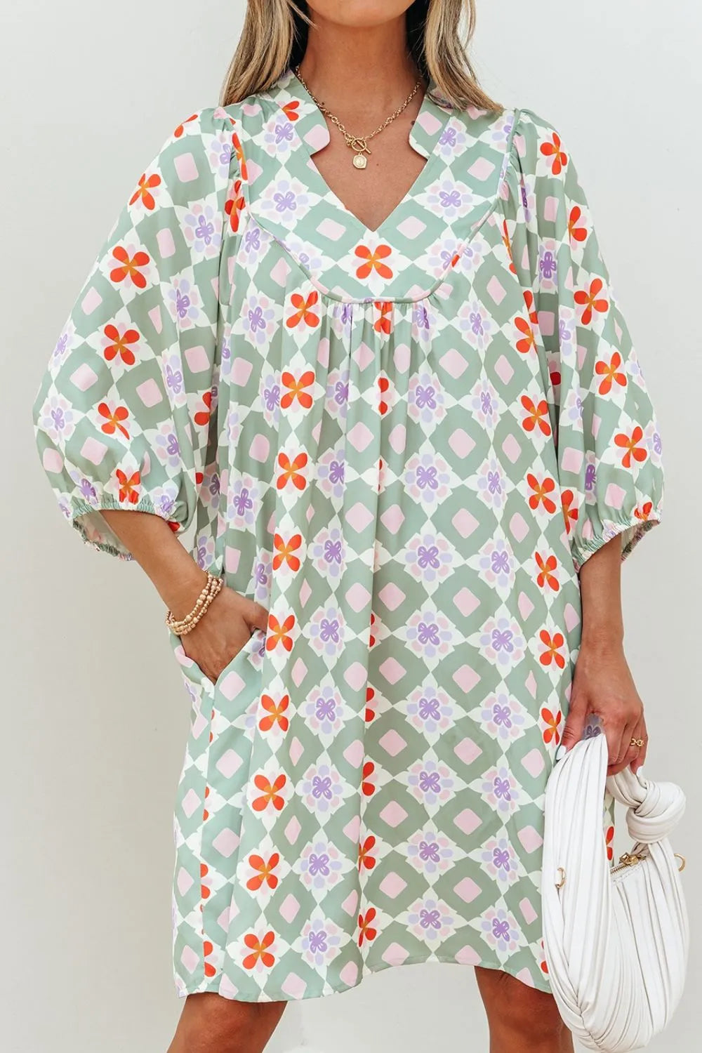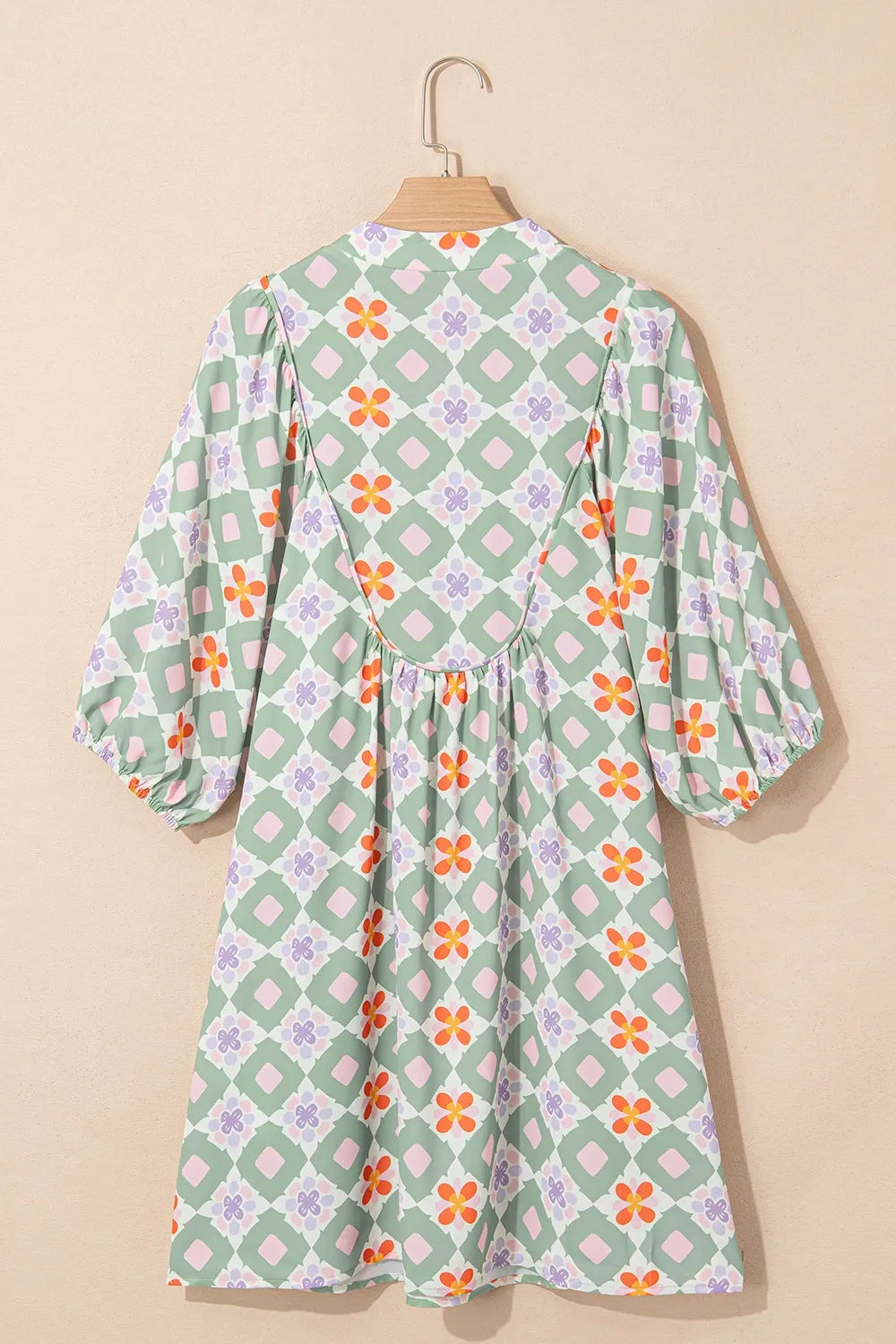 Printed Notched 3/4 Balloon Sleeves Loose Dress