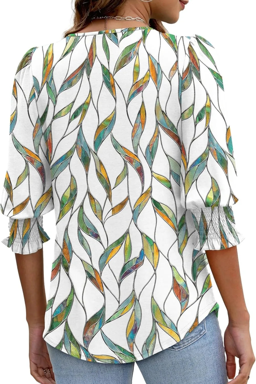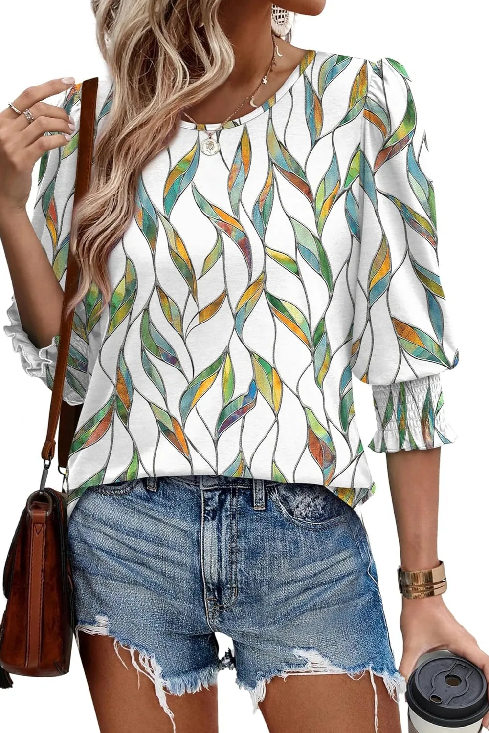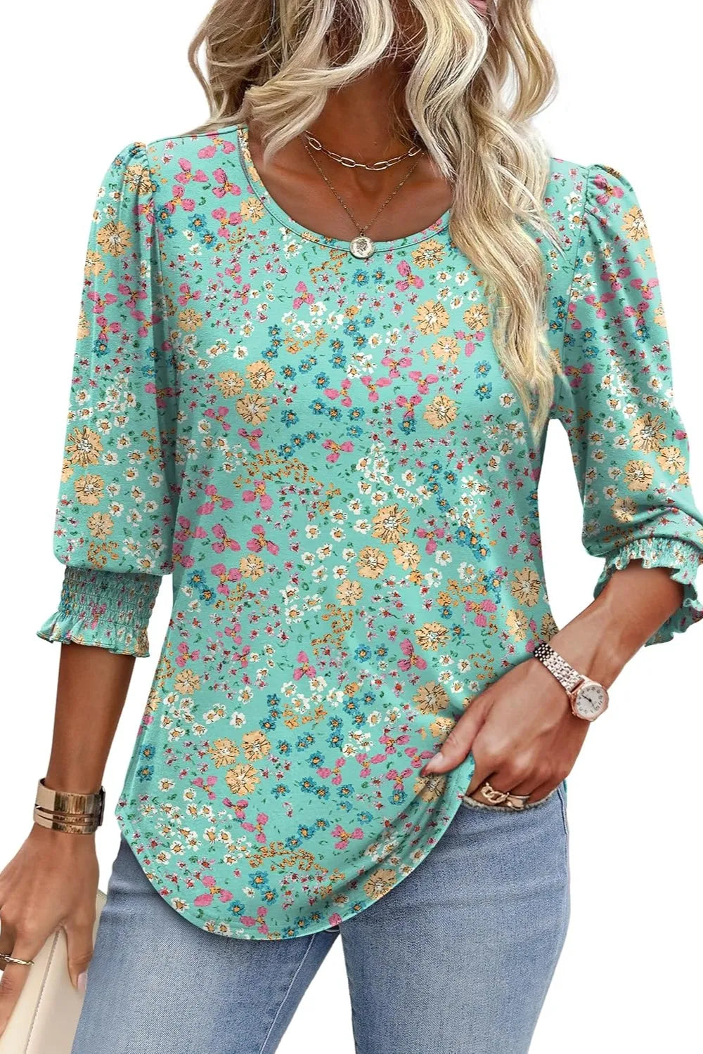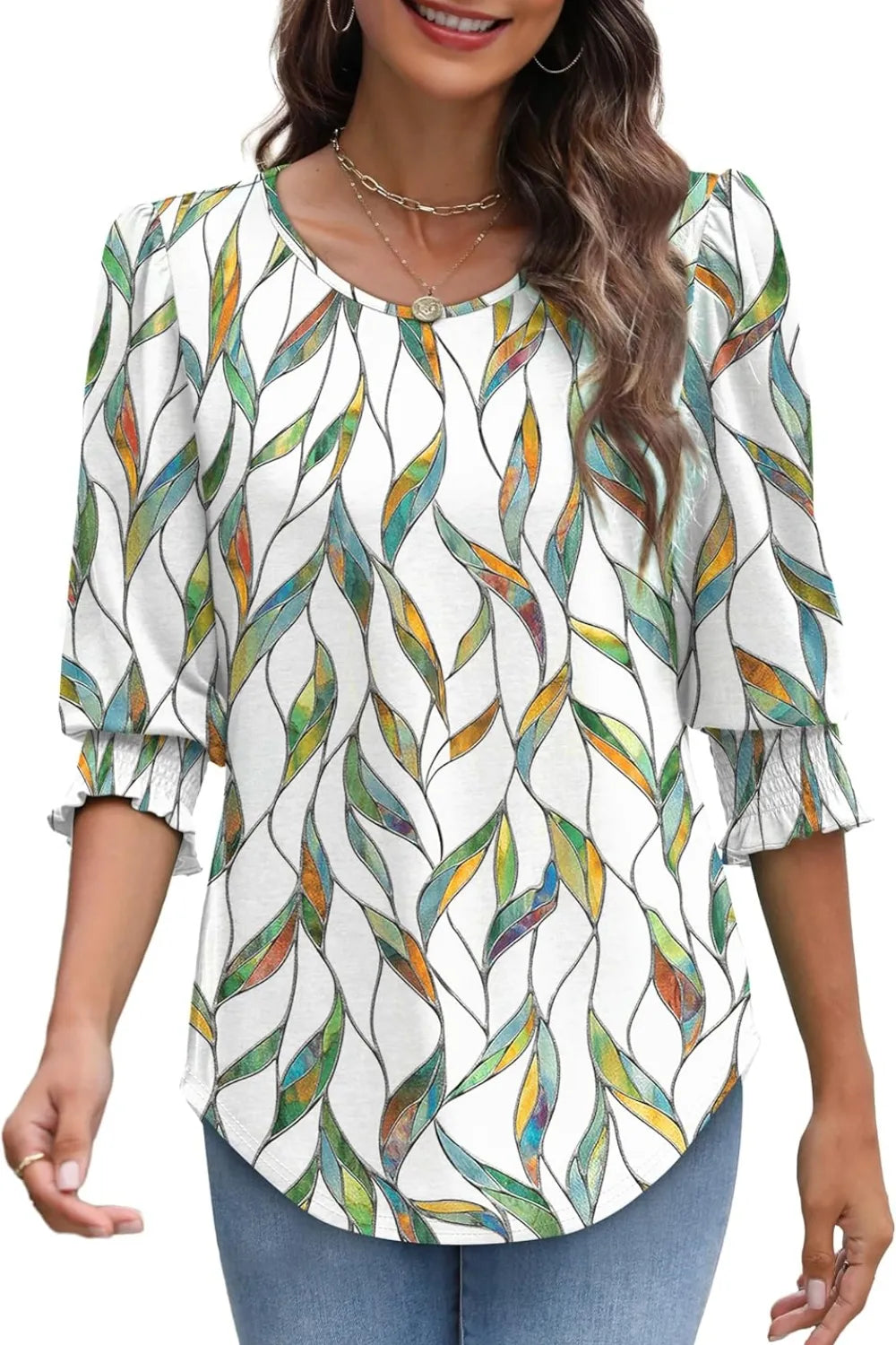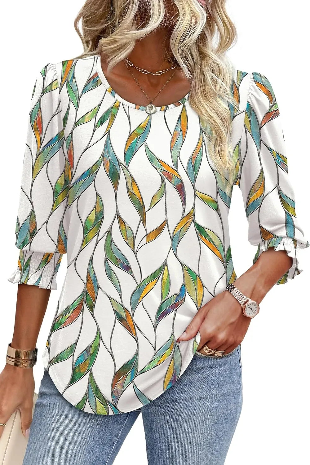 Printed Round Neck Three-Quarter Sleeve Blouse