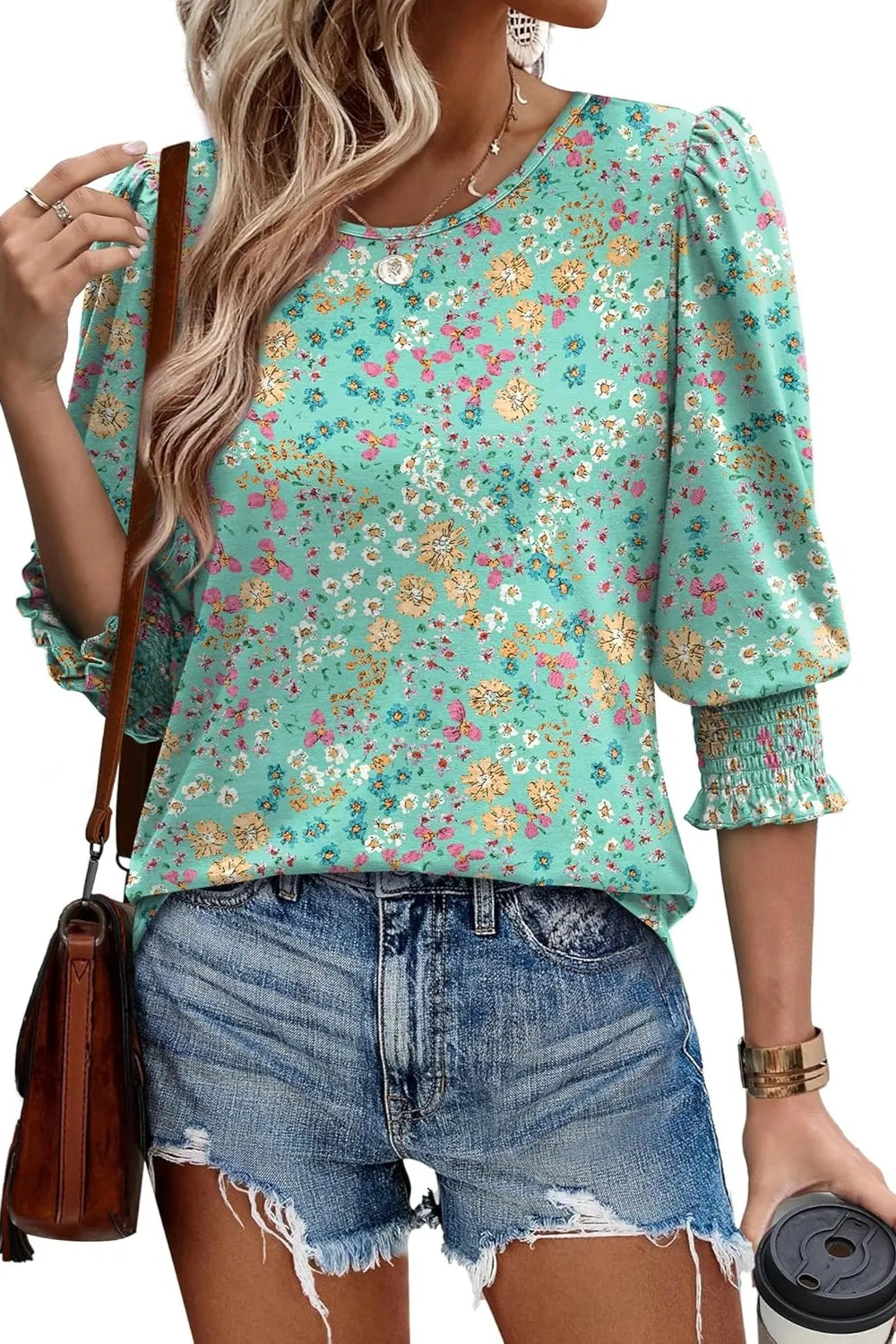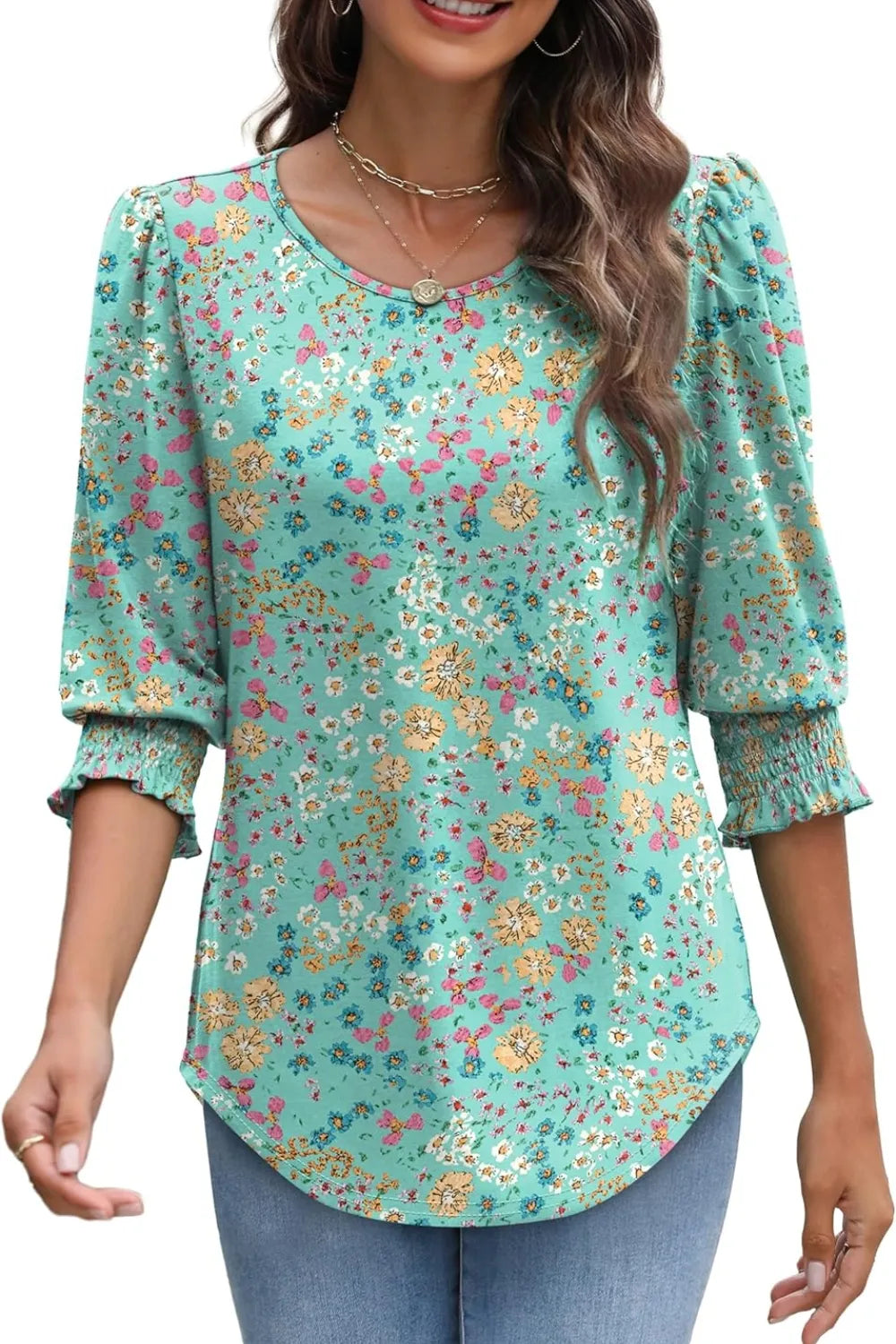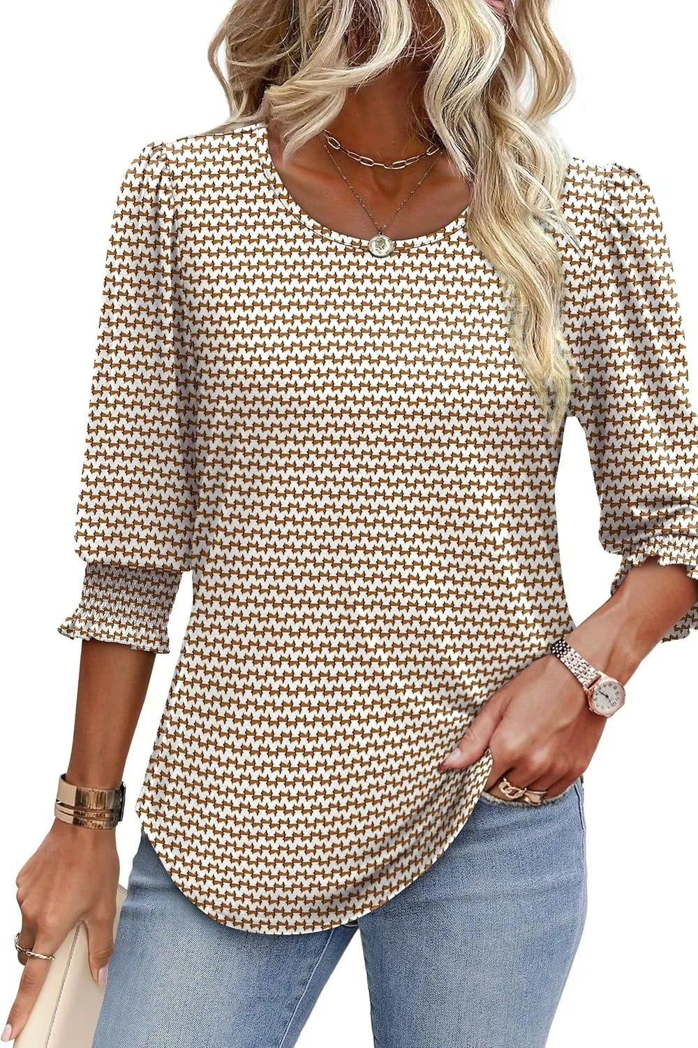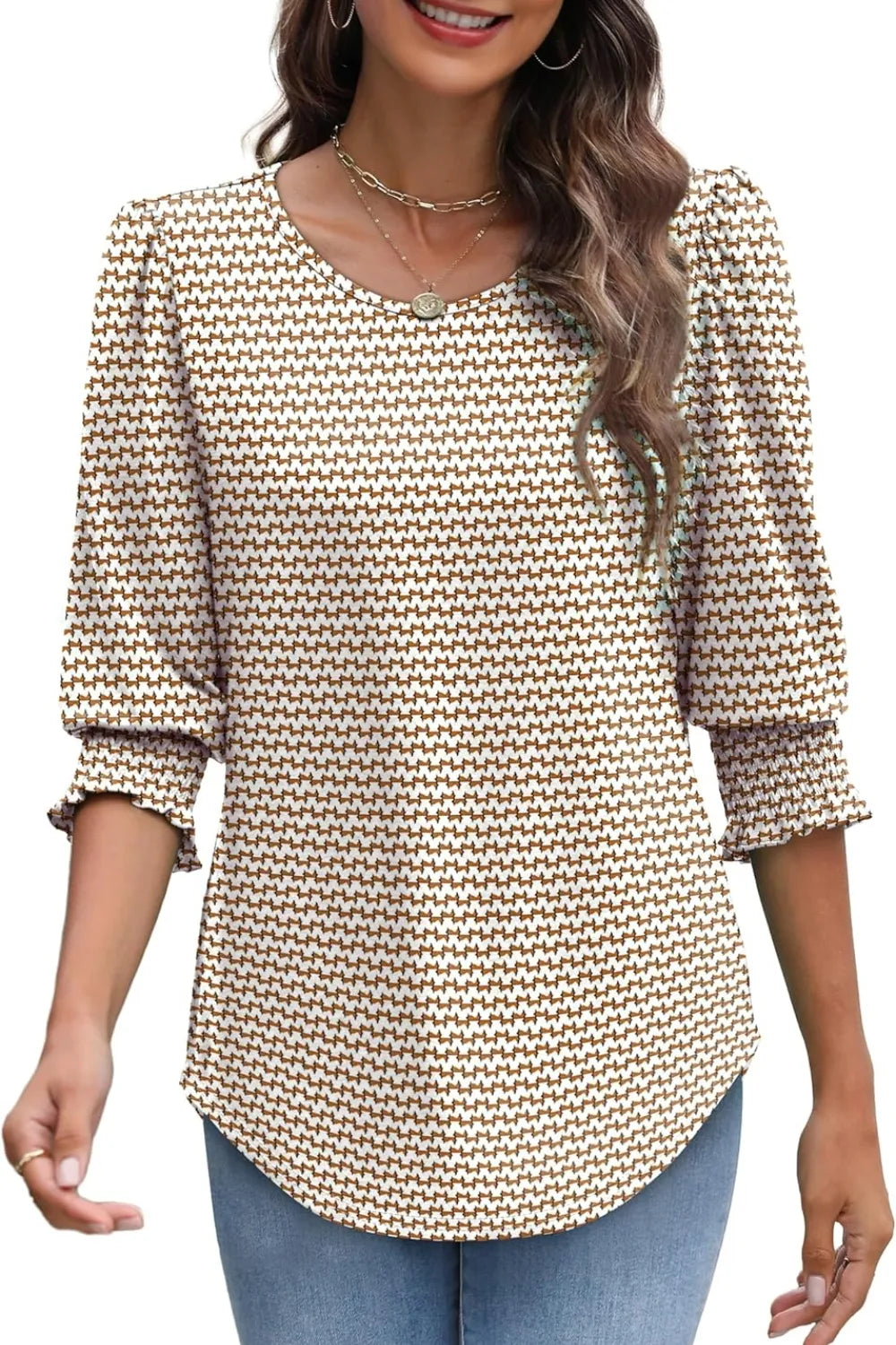 Printed Round Neck Three-Quarter Sleeve Blouse