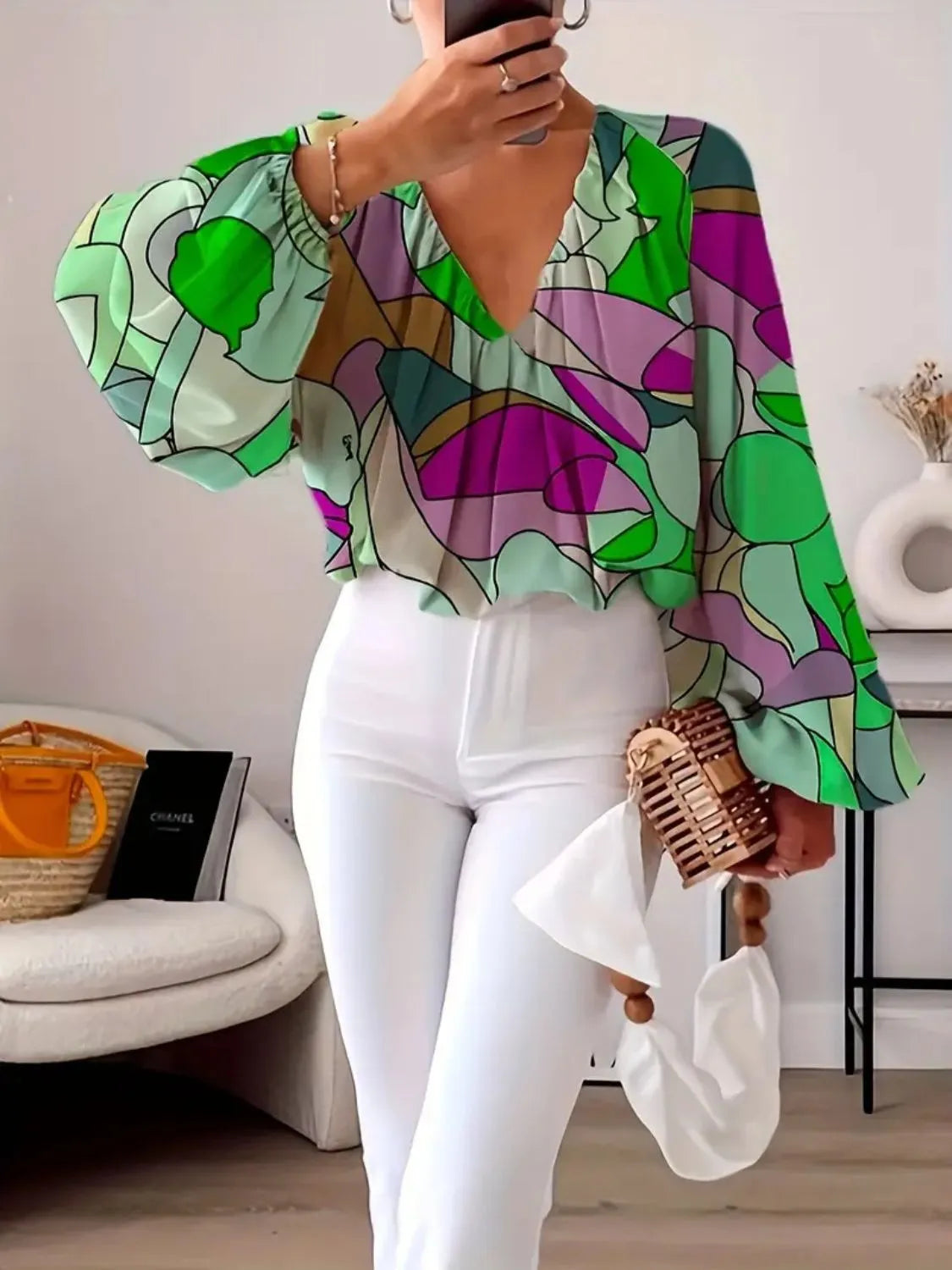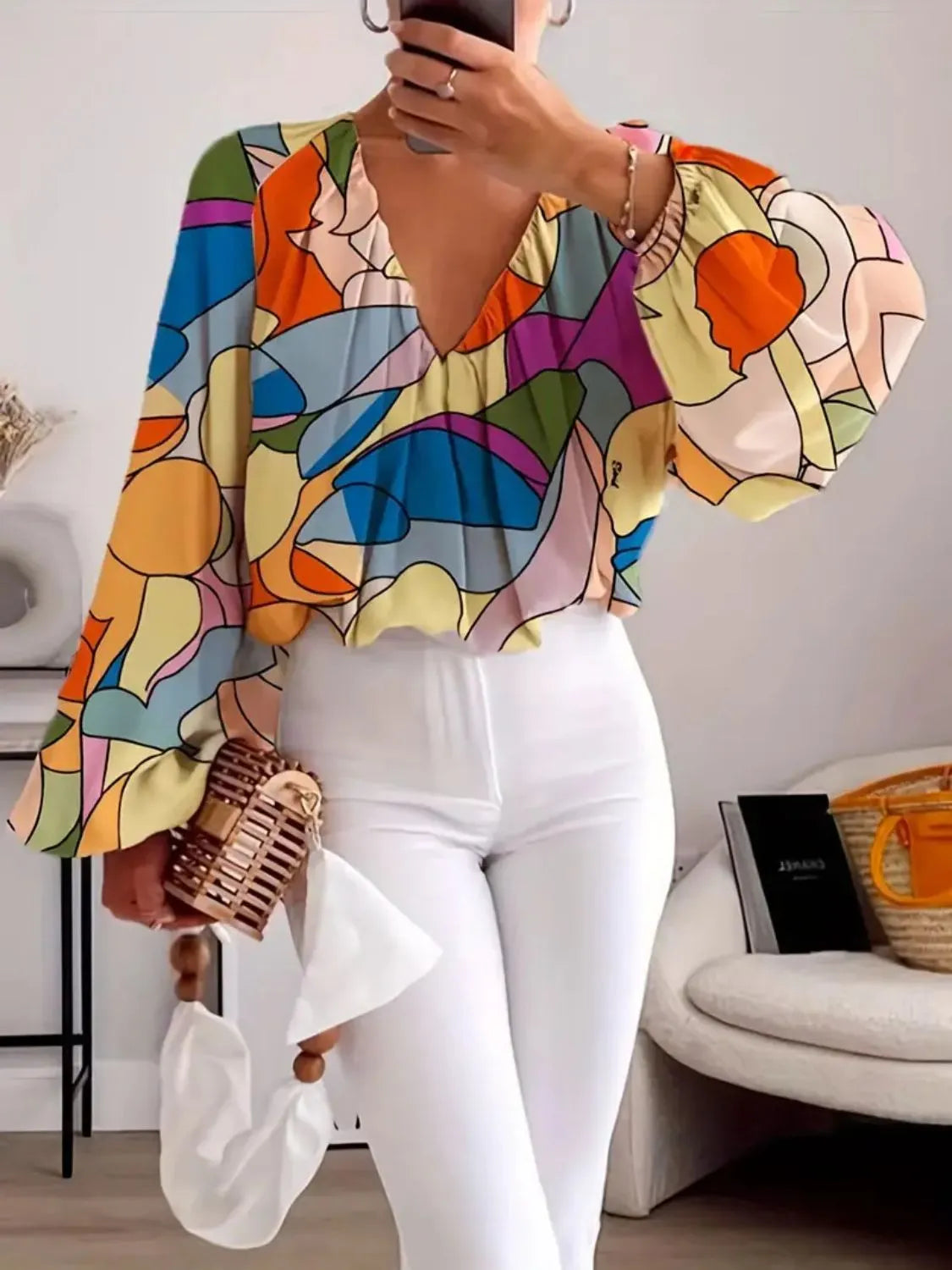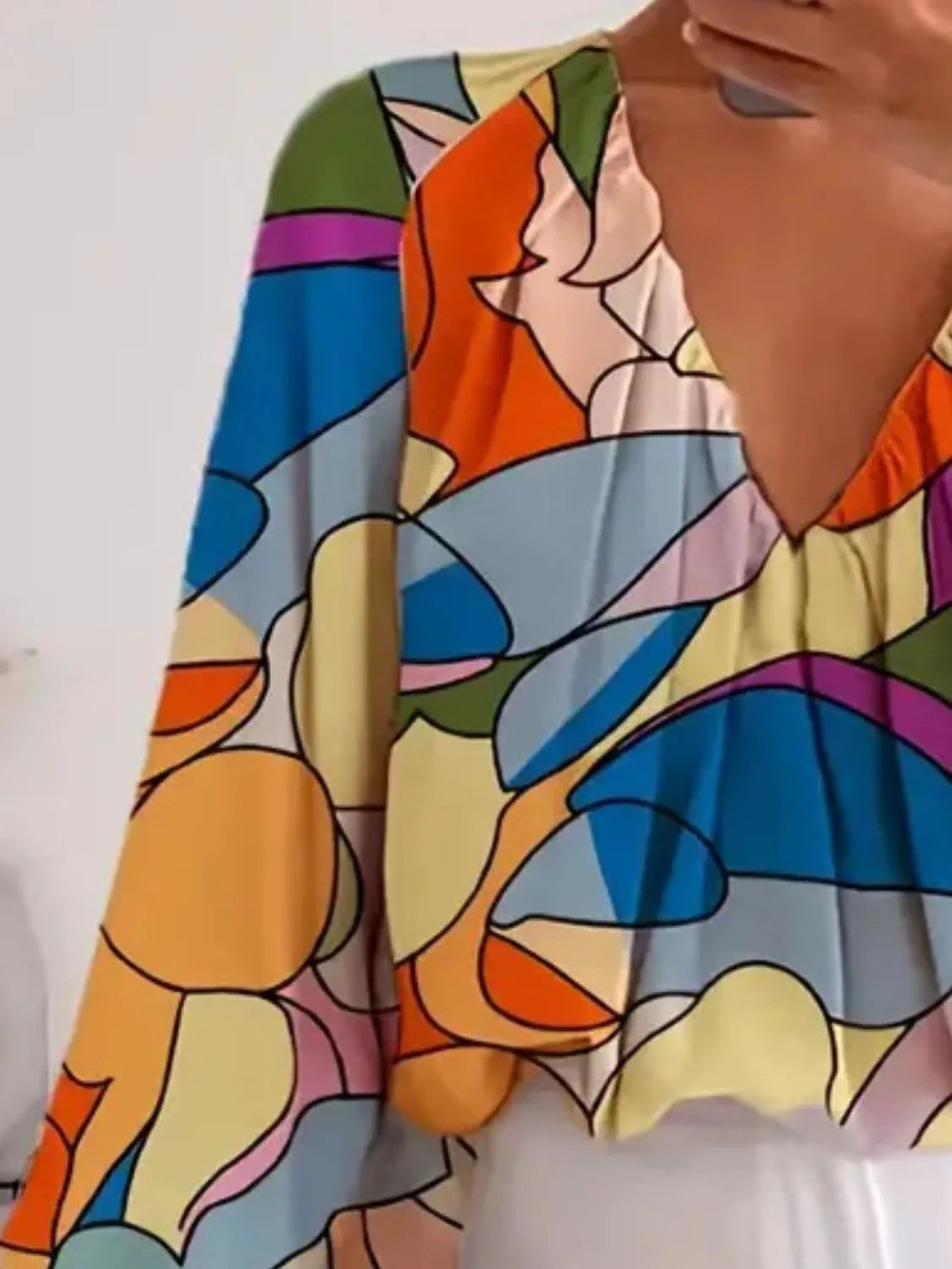 Printed V-Neck Long Sleeve Blouse