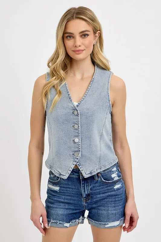 The v-neck button-down vest is a chic and versatile layering piece for your wardrobe. With a flattering v-neckline and classic button-down closure, this vest offers a polished and sophisticated look. Perfect for adding a stylish touch to any outfit, whether paired with a blouse and trousers for a professional ensemble or with a tee and jeans for a more casual vibe. Stay stylish and comfortable with the v-neck button-down vest for a sleek and on-trend outfit.