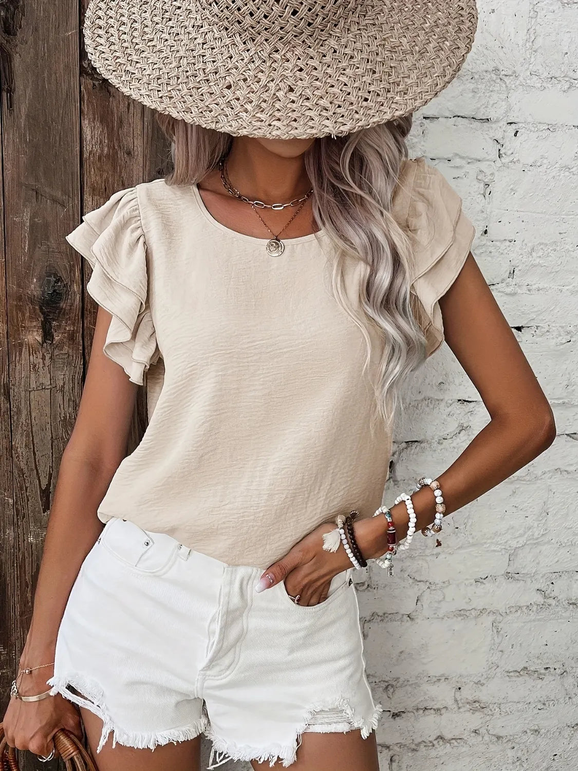 Ruffled Round Neck Cap Sleeve Blouse