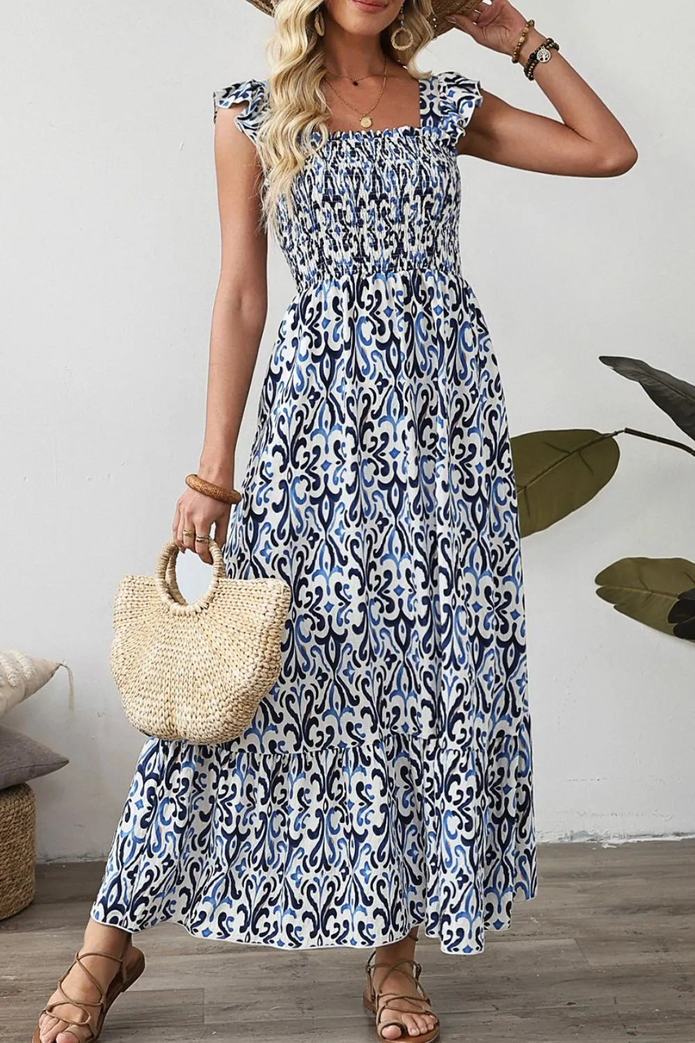 Smocked Printed Square Neck Dress