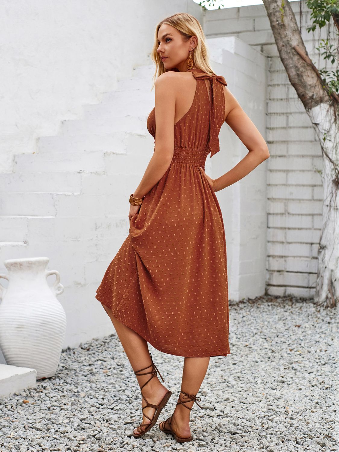 Swiss Dot Grecian Neck Midi Dress