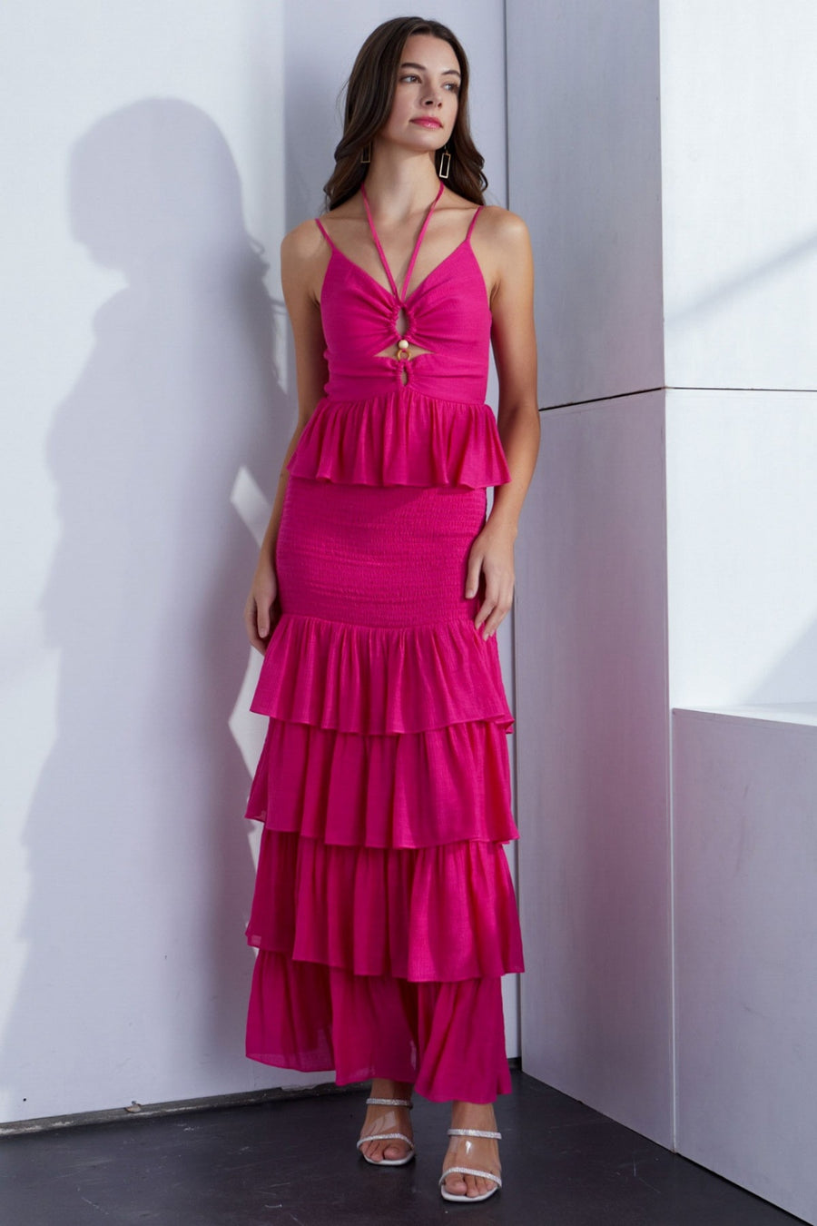 Textured Ruffled Round Neck Cap Sleeve Dress