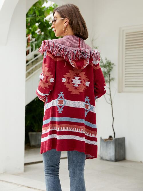 Fringe Geometric Hooded Long Sleeve Cardigan