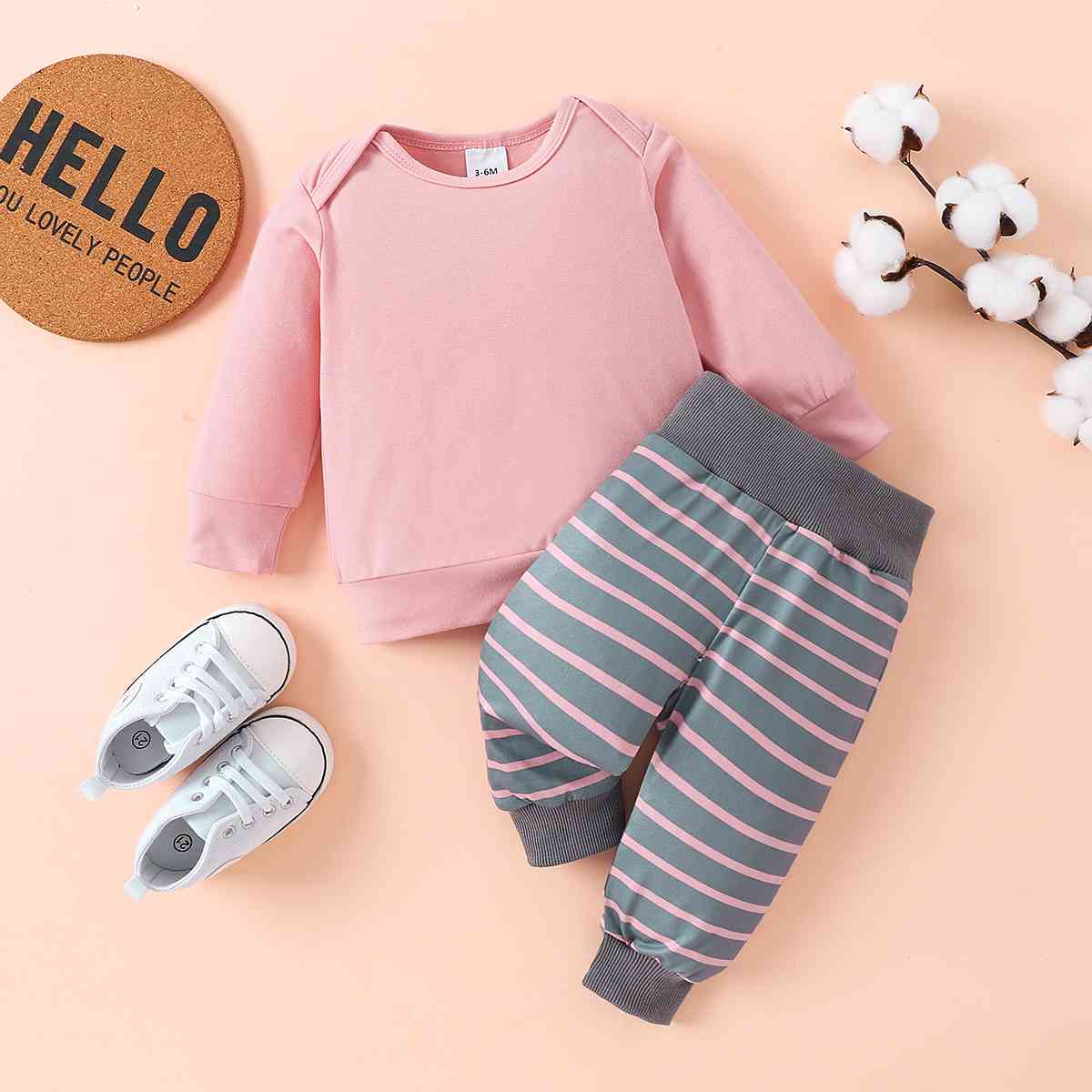 Round Neck Long Sleeve Tee and Stripe Pants Set