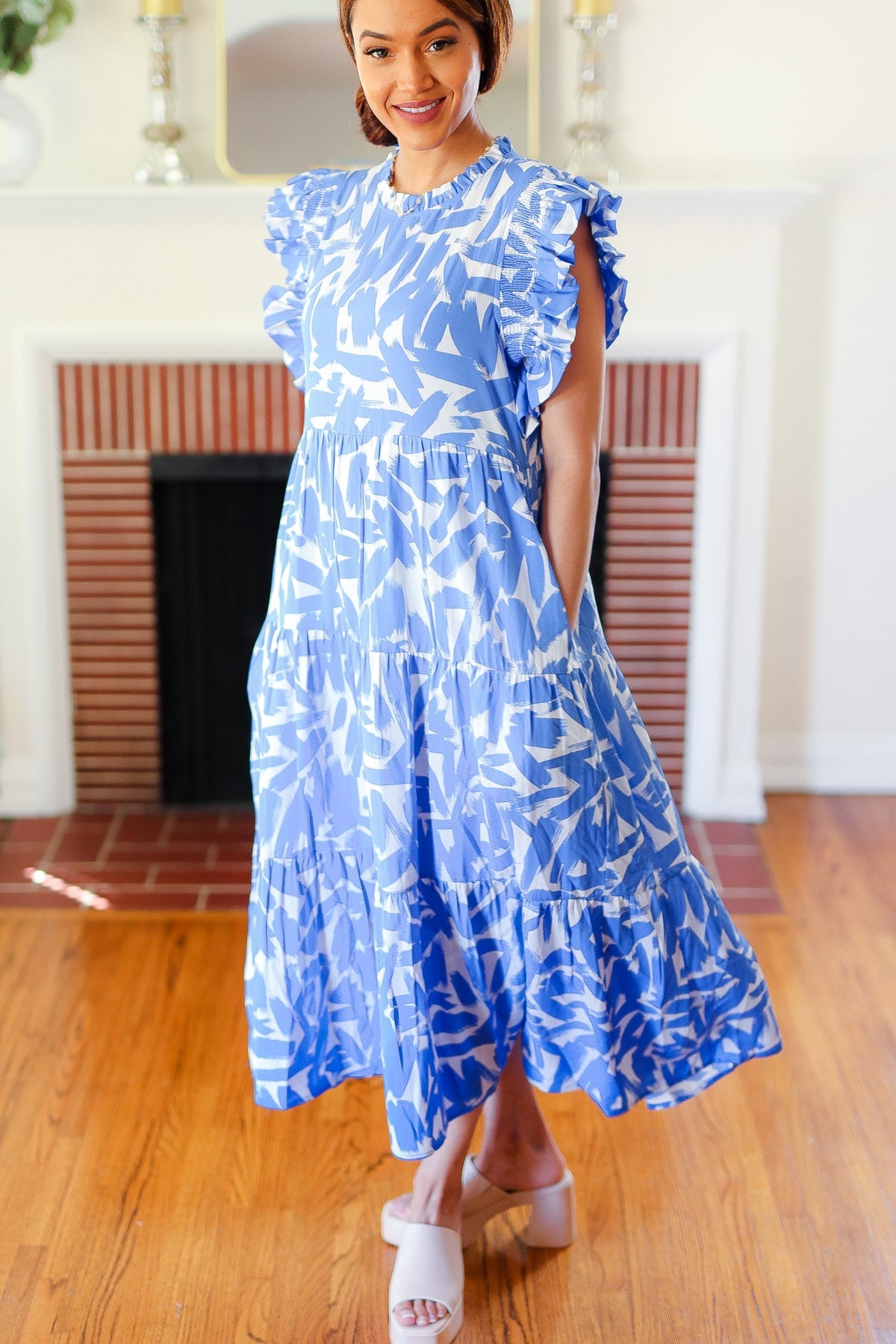 Love Found Sky Blue Abstract Print Tiered Smocked Ruffle Sleeve Maxi Dress