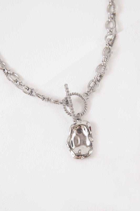 A double silver chain necklace with a sculpted charm.