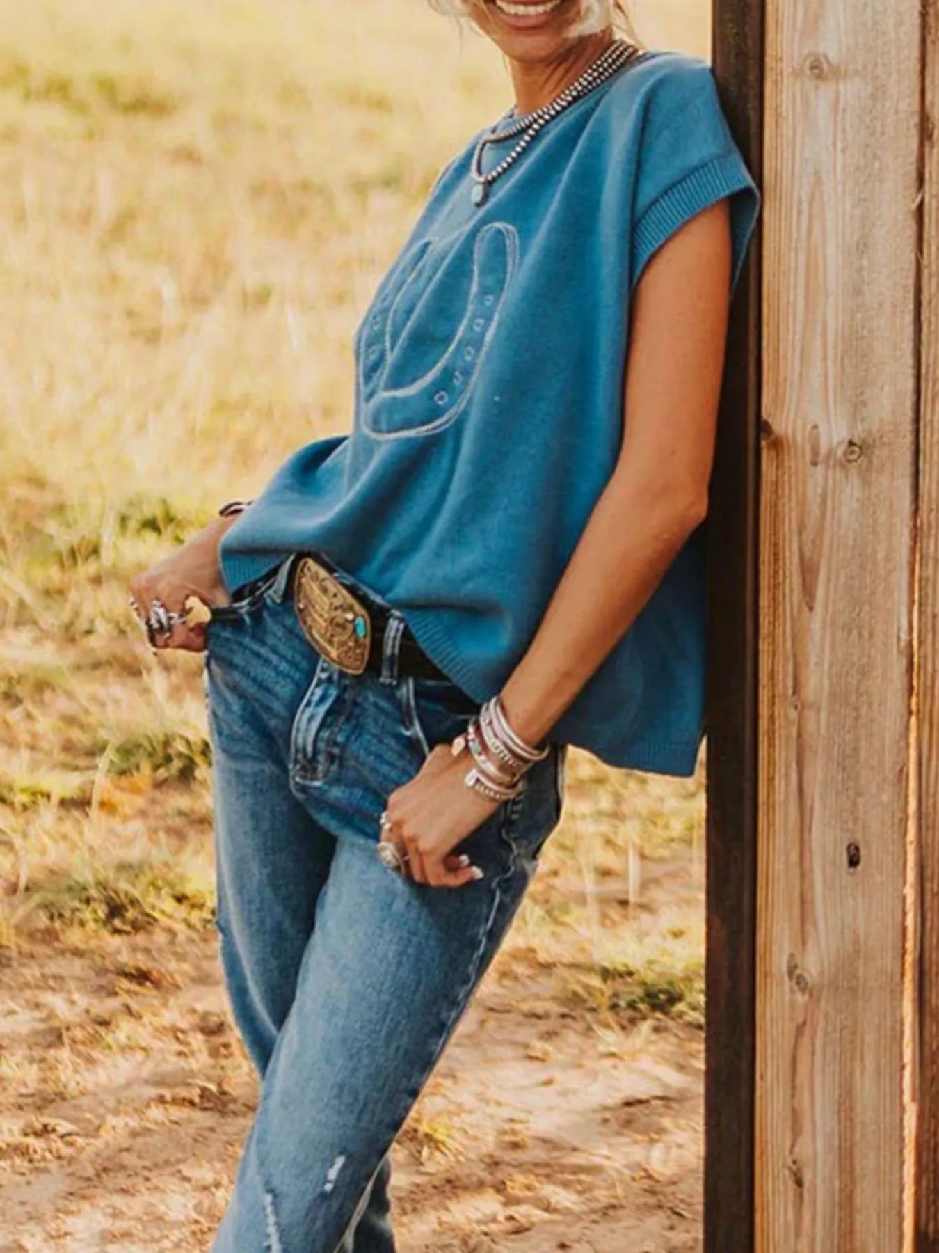 Horseshoe Graphic Round Neck Short Sleeve Sweater