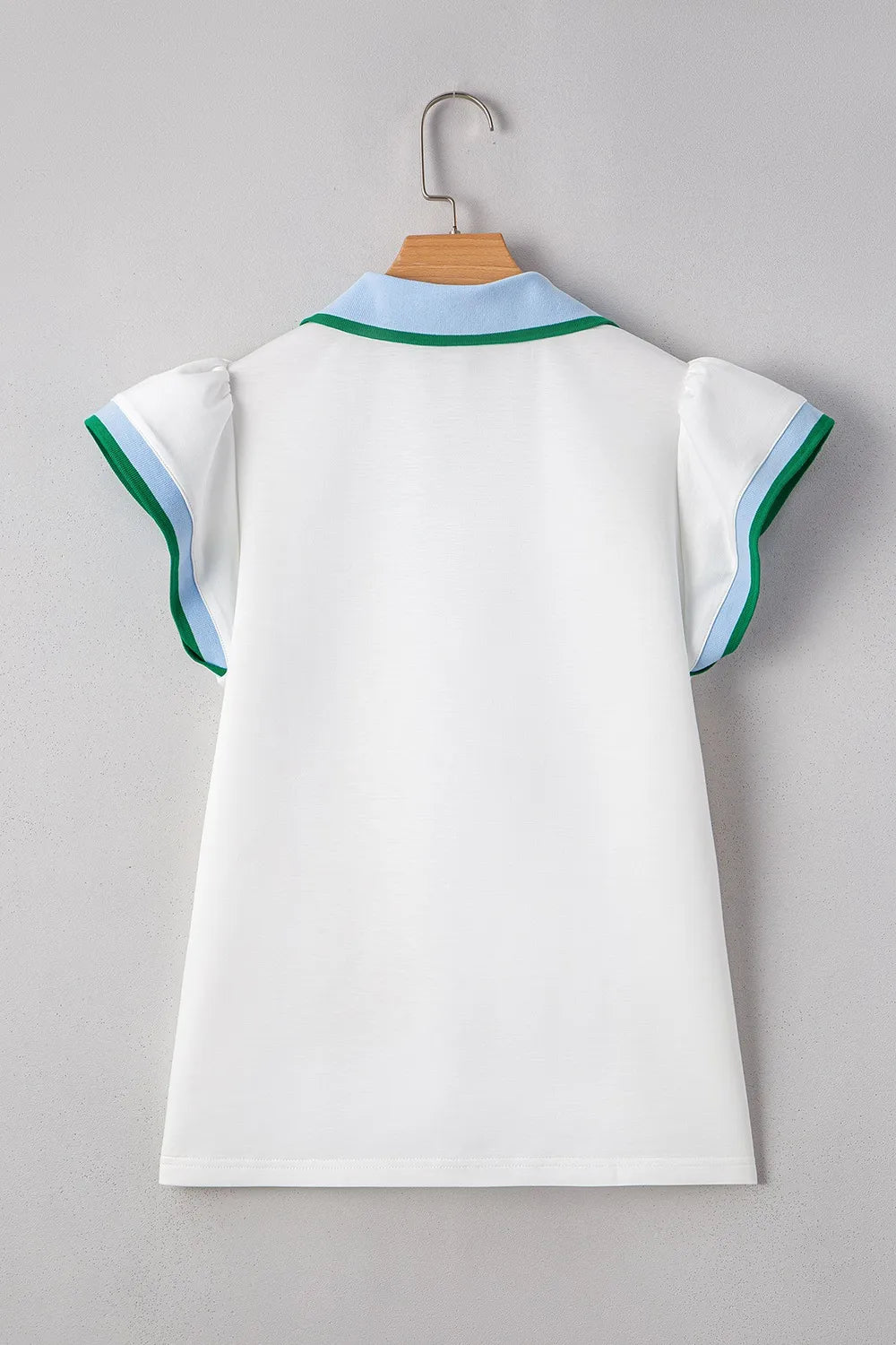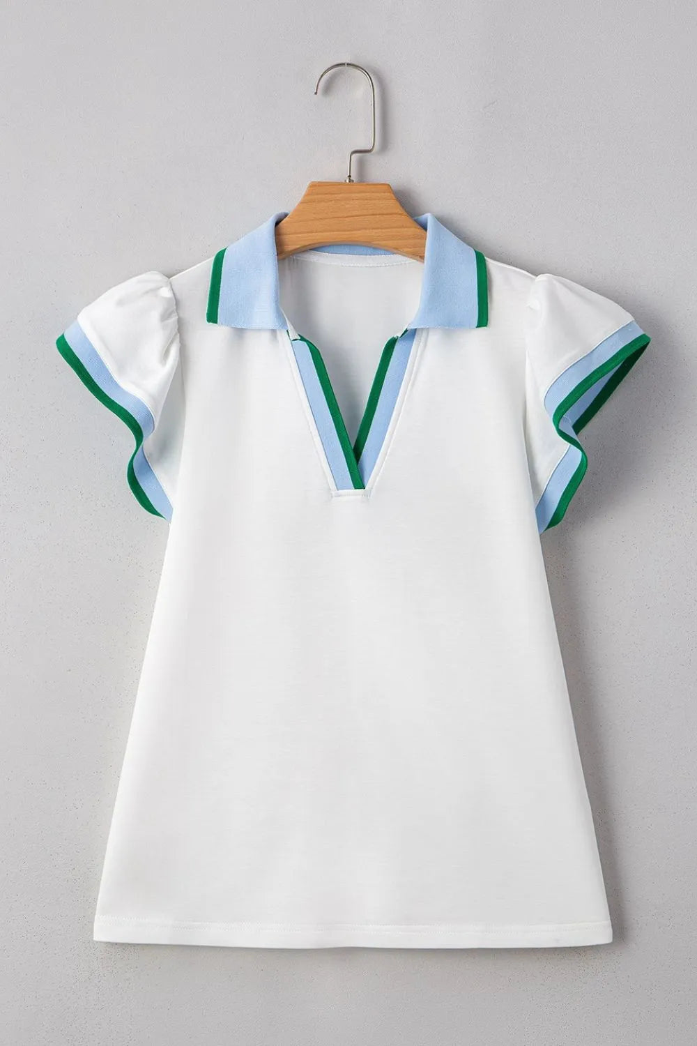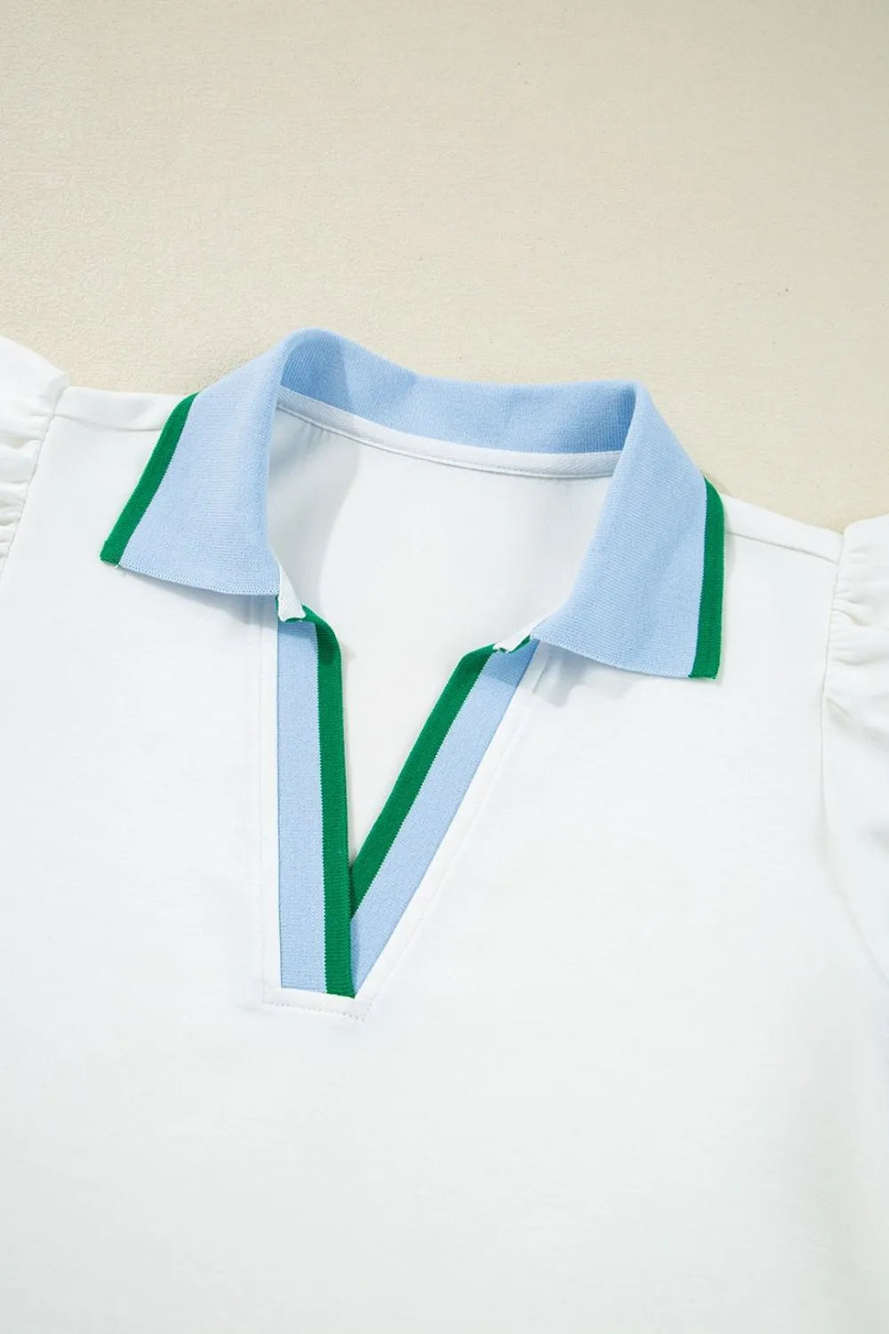 Contrast Ruffled Sleeve Collared V Neck Blouse