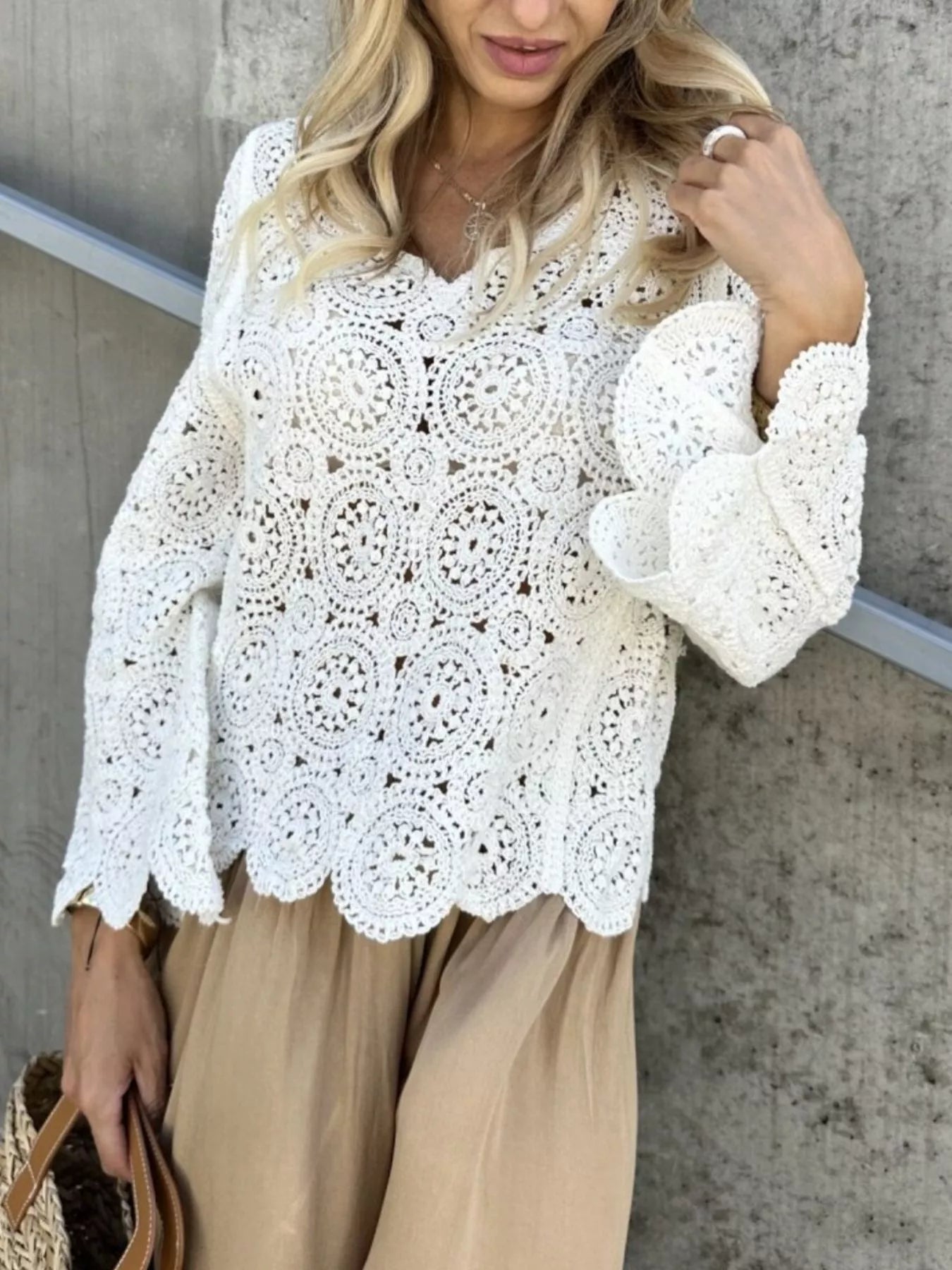 Crochet Lace V-Neck Bell Sleeve Knit Top
